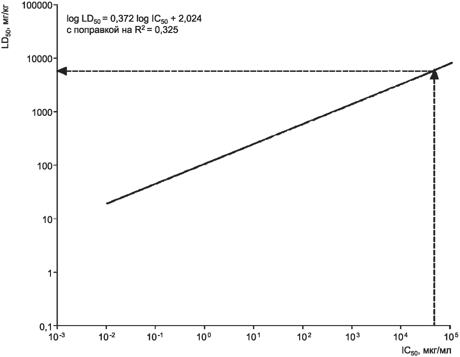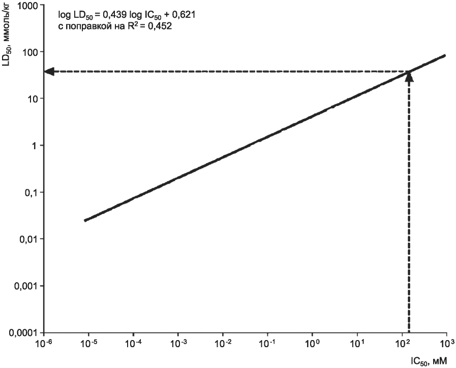 in vitro для прогнозирования уровня летального воздействия веществ при пероральной токсичности, оценивалась исходя из сведений об уровне летальных концентраций (lethal concentrations - LC) для крови/сыворотки человека (LC), полученных по данным трех различных типов наблюдений, а именно: 1) значений LC при острой токсичности, измеренных в клинических условиях; 2) значений LC при острой токсичности, измеренных посмертно при патолого-анатомическом исследовании; 3) пиковых значений LC, определенных по аппроксимированным кривым изменения значений LC