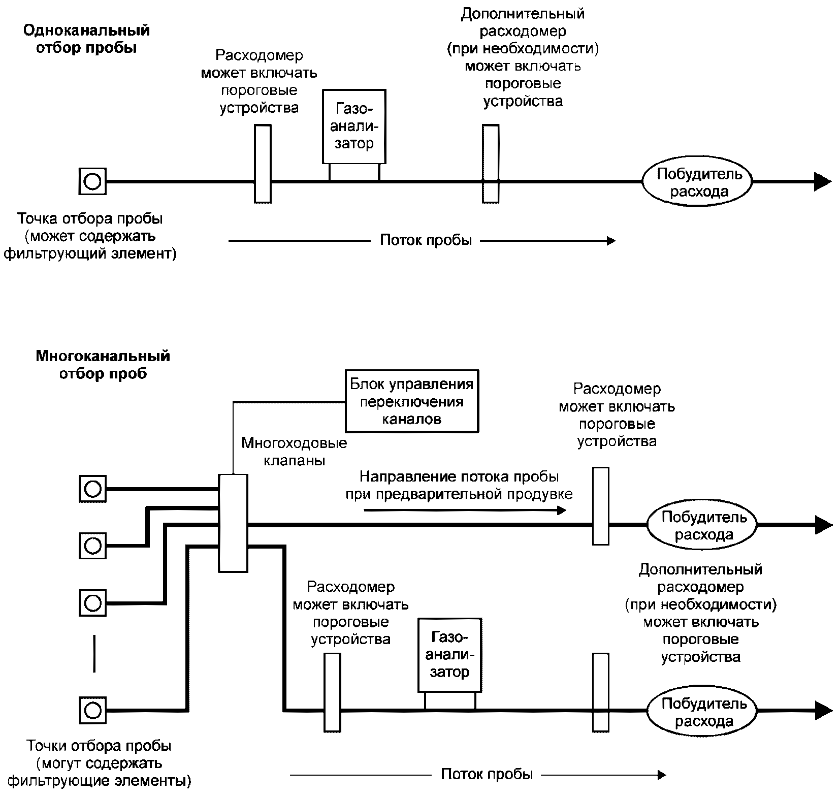 Все устройства связаны единой линией транспортирования. Необходимо тщательно выбирать материал линии транспортирования, так как некоторые материалы могут быть нестойкими к воздействию отдельных компонентов пробы или поглощать отдельные компоненты, искажая пробу. В состав оборудования при одноканальном отборе пробы могут включаться устройства подготовки (кондиционирования) пробы (на рисунке не показаны).