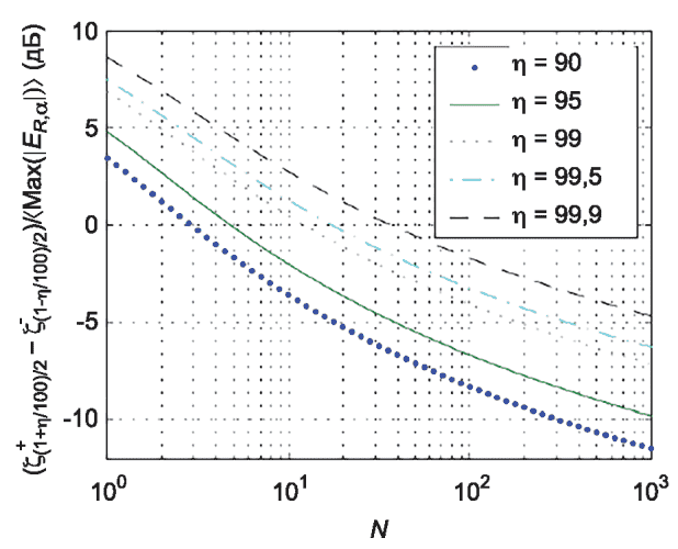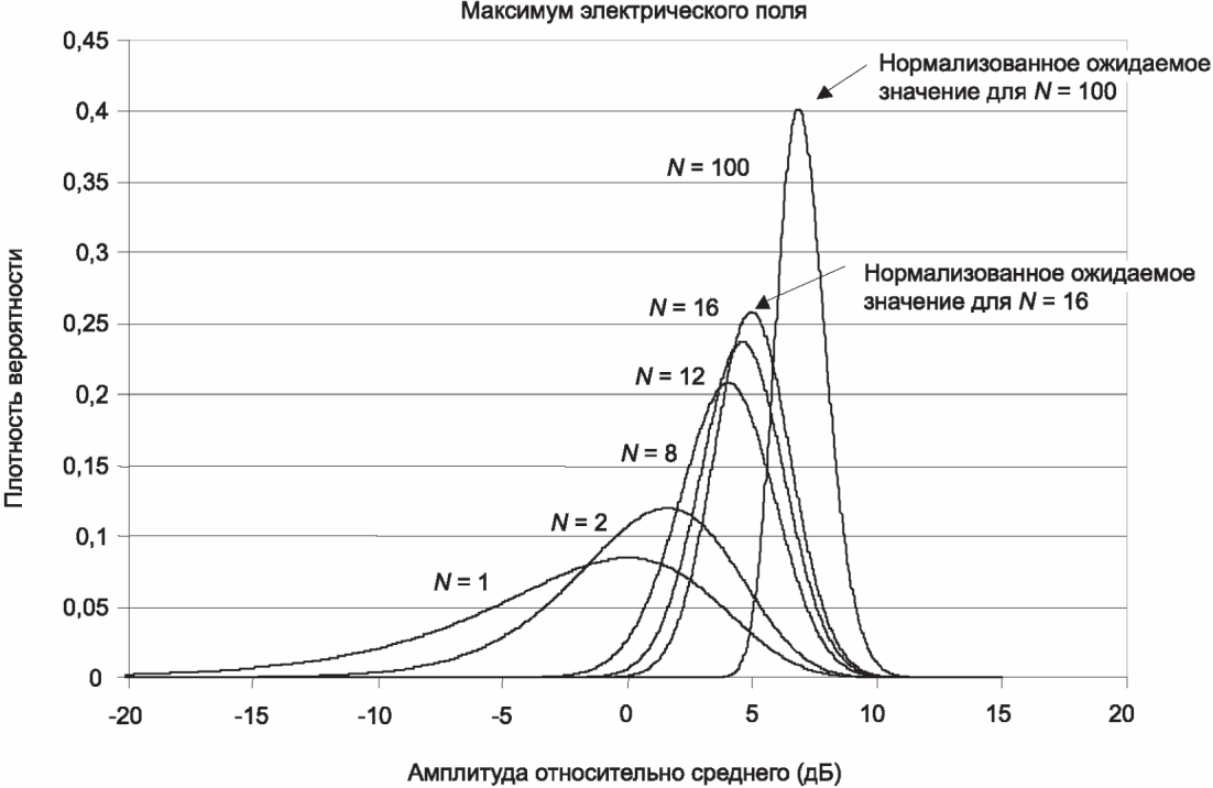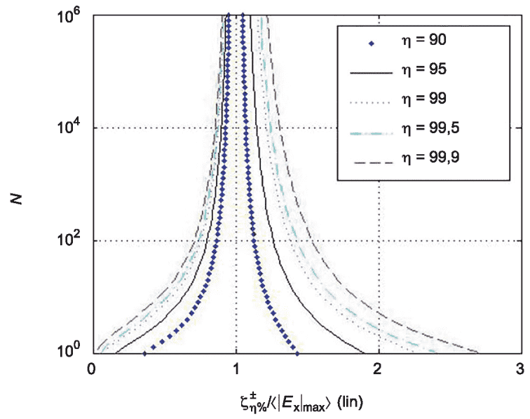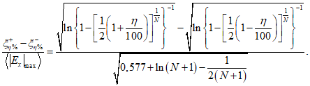 Примечание - Средняя нормированная ширина  для максимальной напряженности поля  связана с доверительным интервалом  для  и основана на заданном количестве независимых положений мешалки N. | Примечание - Средняя нормированная ширина  для максимальной принятой мощности Px,max связана с доверительным интервалом  для Px,max и основана на заданном количестве независимых положений мешалки N. |