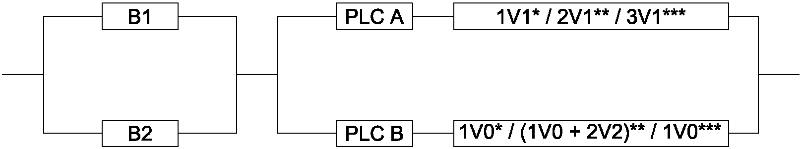 Проверка правдоподобия B1 и B2 с помощью PLC A и PLC B дает DC 99% для B1 (см. ISO 13849-1:2006, таблица E.1). | |||||