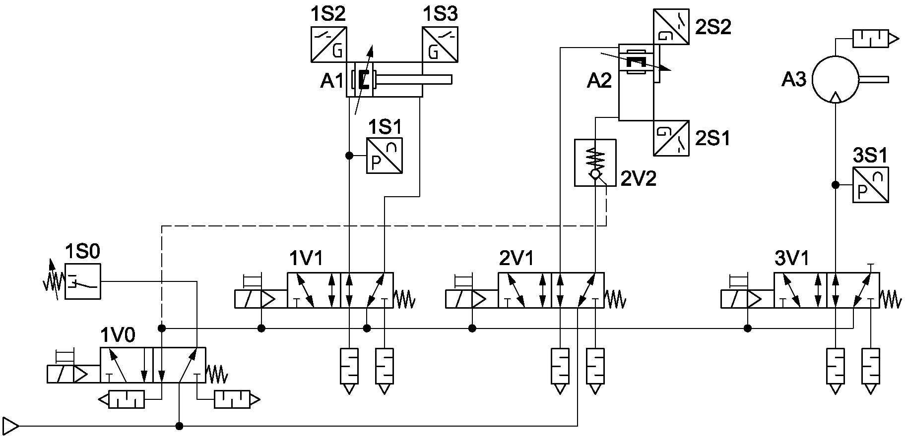 1V0 | Воздух системы управления для направляющих клапанов 1V1, 2V1, 3V1 и для обратного клапана 2V2 | Электромагнитный клапан управления направлением движения | Пружинный клапан, 5/2-функция, пилотный, внутренняя подача пилотного воздуха, золотниковый клапан с перекрытием | Таблица B.2. Завышение размеров/коэффициент безопасности, безопасное положение (использование испытанной пружины), достаточное принудительное перекрытие в поршневых клапанах | Повышение давления в канале 4 при откачанном канале 5 в нормальном положении, нарушение герметичности из-за выдавливания, перемещение золотника клапана без рабочей мощности |