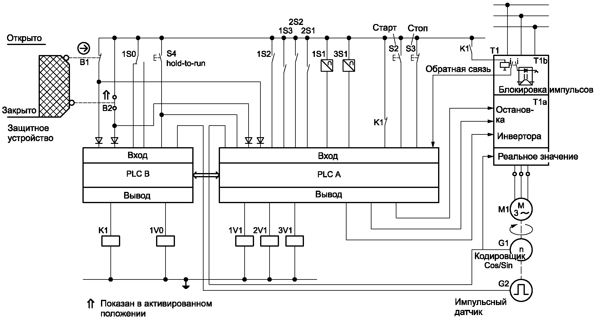 Самопроизвольное замыкание контактов при открытом ограждении (механические неисправности) | Неисправность распознается независимо и немедленно PLC A и PLC B в результате отсутствия соответствующего изменения сигнала в B1 | Электродвигатель M1 останавливается через T1a PLC A и через K1 и T1b PLC B, и повторный запуск предотвращается | Подайте статический высокий уровень на соответствующий вход обоих PLC, пока защита открыта | ||