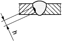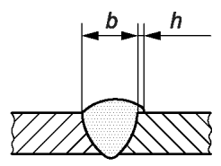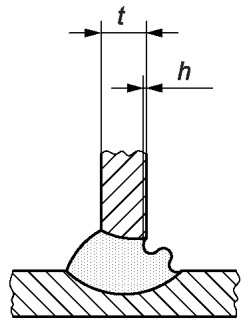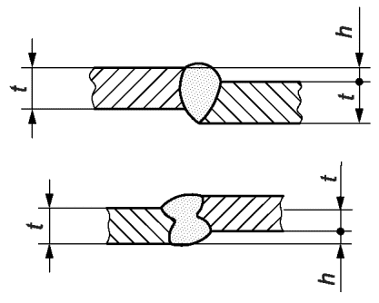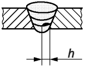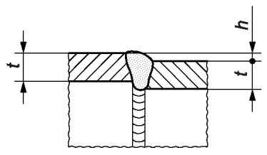 1.10 | 504 | Превышение проплава | Применяется для корня шва при односторонней сварке | >= 0,5 | h <= 0,2 мм + 0,3·t или 5 мм, меньшее из этих значений | h <= 0,2 мм + 0,2·t или 5 мм, меньшее из этих значений | h <= 0,2 мм + 0,15·t или 5 мм, меньшее из этих значений |