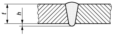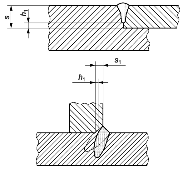 2.8 | 402 | Непровар | Непровар h1 при полном проплавлении сварных швов должен быть менее: Неполное проплавление может быть установлено для конкретного случая. Рисунки ниже являются примерами. Ограничения относятся к h1, что приводит к проплавлению менее установленного. Требуемая глубина проплавления: | | | | |