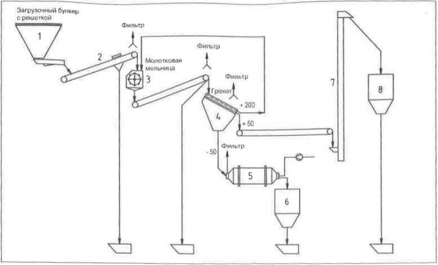 Рукавные фильтры | Очистка от пыли аспирационного воздуха при разгрузке, складировании, транспорте, пересыпке, измельчении, грохочении сырьевых материалов, полупродуктов, товарной продукции, отходящих газов РТП (с силосами, оснащенными системами для уплотнения пыли) | Типа СМЦ, ФРКН, ФРИА и др. с термостойкой тканью (до 250 °C) для рукавов; КПД - до 99%, с отдувкой и регенерацией остаточная запыленность - 10 - 20 мг/м3 |