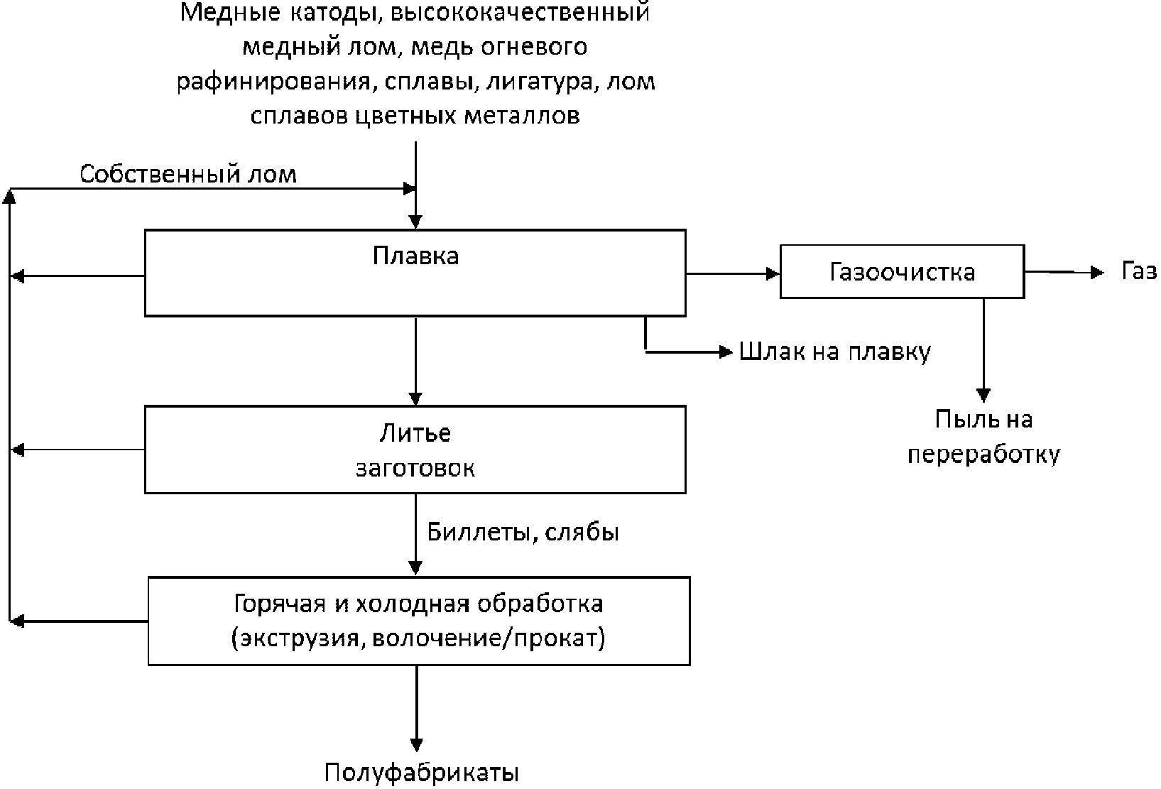 - выплавка медных заготовок, включая производство сплавов, в том числе из вторичных продуктов, на плавильных производствах;