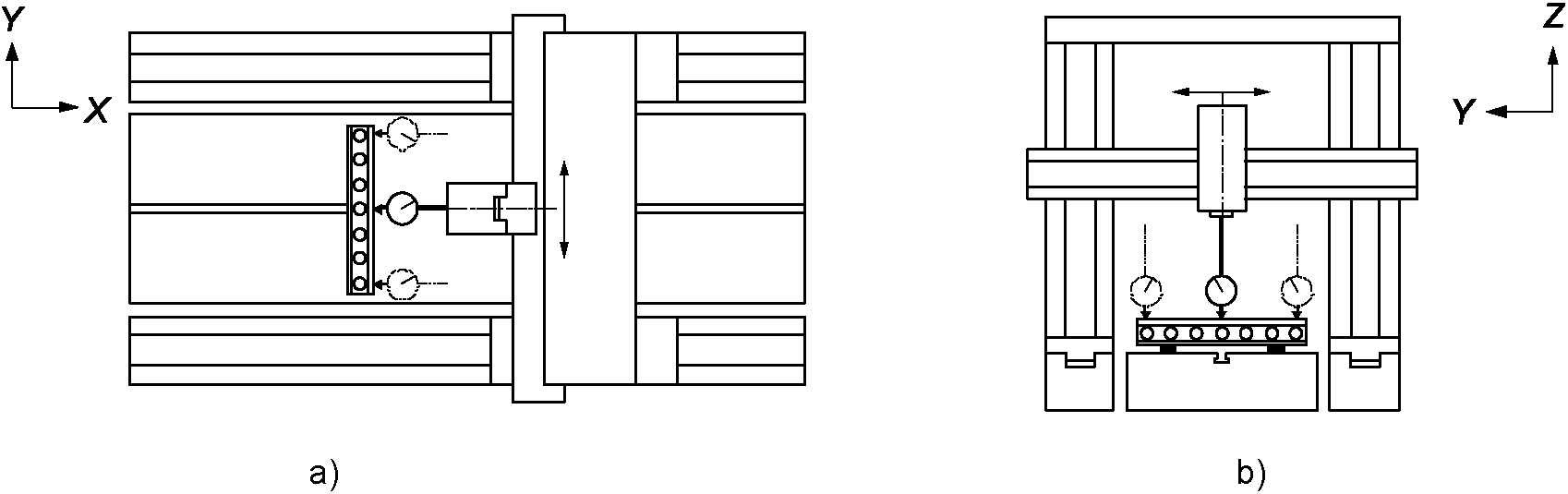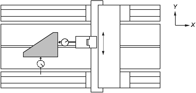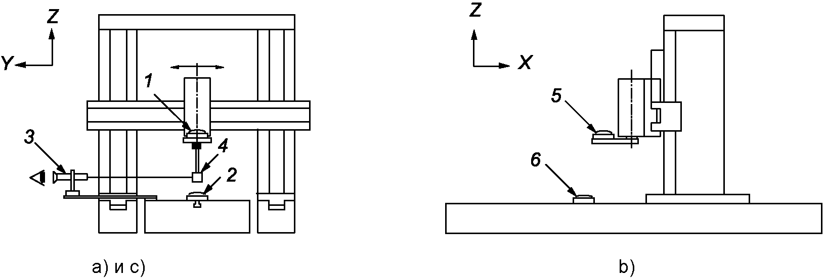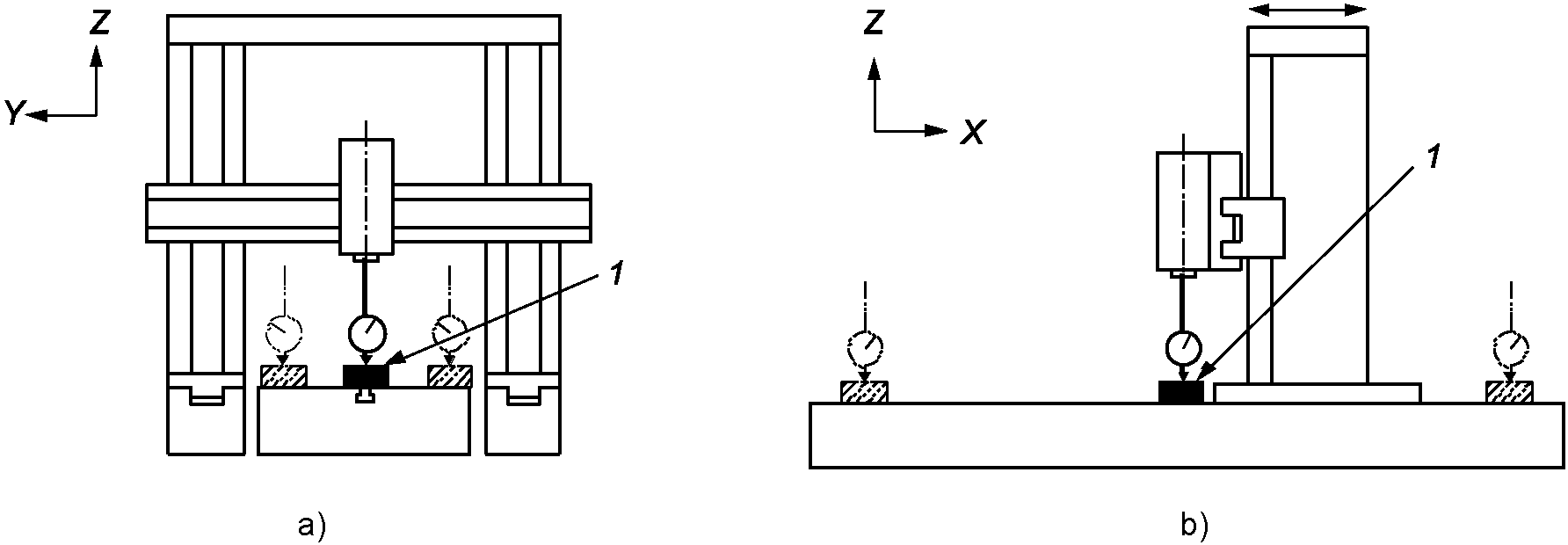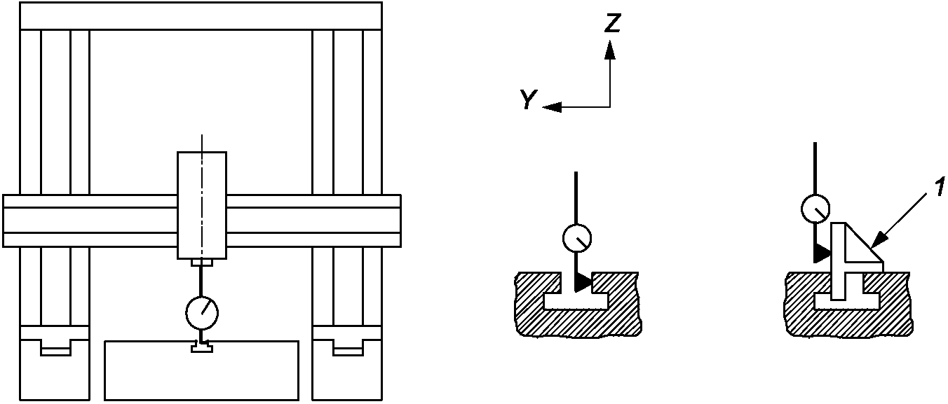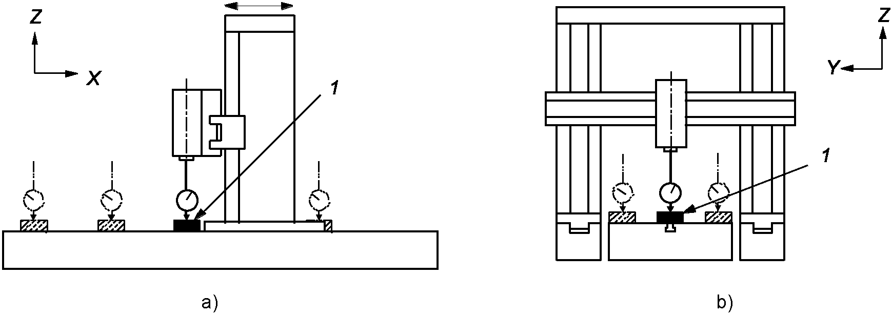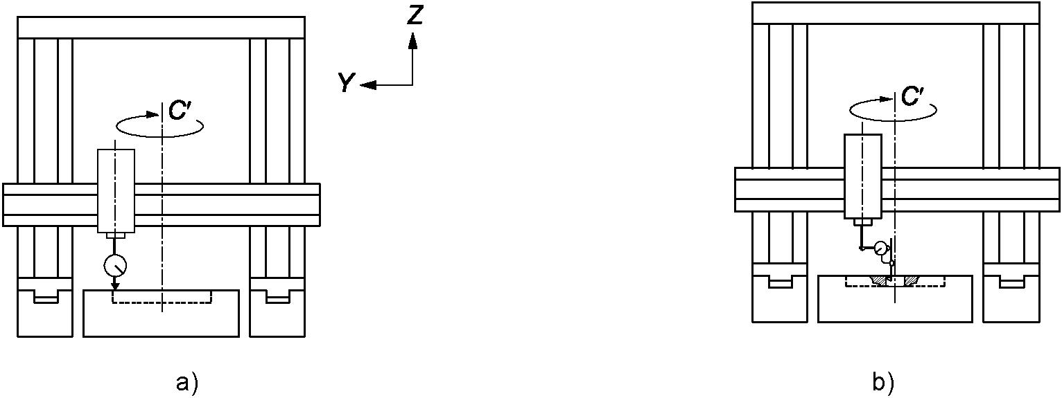 Замечания и ссылки на ИСО 230-1:2012, 8.2.2.1, 8.2.2.3, 8.2.2.4 и 8.2.2.5 Следует зафиксировать подвижную поперечину в середине хода и переместить портал в середине хода. Следует установить линейку на столе с опорной поверхностью, приблизительно параллельной оси Y: в горизонтальной плоскости для a) и в вертикальной плоскости для b). Если шпиндель возможно заблокировать, на нем можно установить индикатор часового типа. Если шпиндель невозможно заблокировать, индикатор часового типа следует установить на ползун. Следует переместить шпиндельную головку в направлении Y по длине измерения и записать показания. Длина измерения обычно равна длине между двумя колоннами (не полной длине поперечины). В других случаях это должно быть согласовано между изготовителем/поставщиком и пользователем. Измерения следует проводить не менее чем в шести положениях вдоль хода с равноотстоящими шагами, не превышающими 400. | |||||