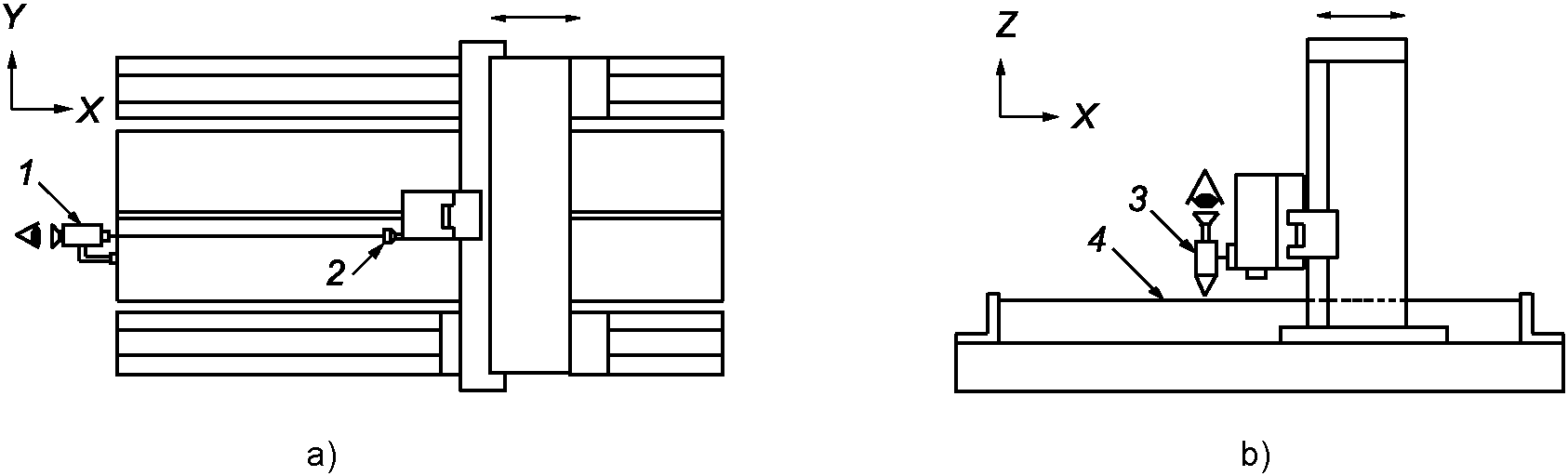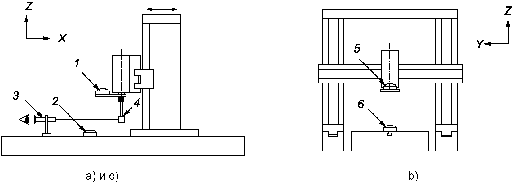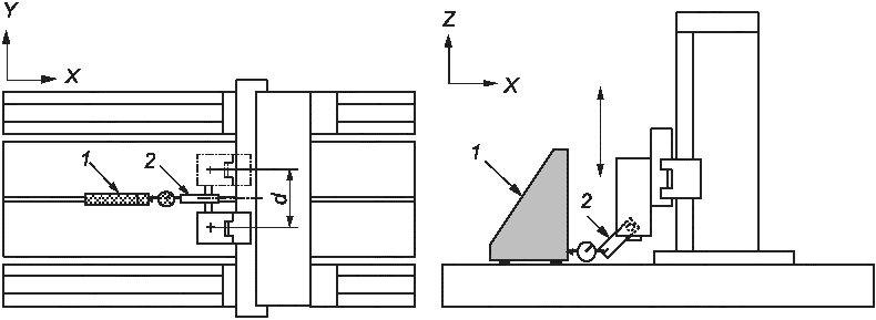 Замечания и ссылки на ИСО 230-1:2012, 8.2.2.1, 8.2.2.2, 8.2.2.3 и 8.2.2.4 Для a) натянутая струна не рекомендуется из-за провисания струны. Установочный телескоп можно установить на столе для крепления заготовки таким образом, чтобы оптический луч был параллелен движению портала по оси X, или отсутствие параллельности следует учитывать при измерении. Если шпиндель можно зафиксировать, на нем можно установить мишень телескопа. Если шпиндель невозможно зафиксировать, следует установить мишень телескопа на шпиндельной головке. Для b) микроскоп следует закрепить на шпинделе, если его можно зафиксировать, или на шпиндельной головке. При использовании оптических приборов следует учитывать, что их погрешность измерения для большой длины измерения может быть выше, чем погрешность измерения микроскопа и натянутой струны. Для a) и b) измерения следует проводить не менее чем в шести положениях вдоль хода с равномерным шагом, не превышающим 500. Перемещают портал в направлении оси X и записывают показания. Измерения необходимо проводить с осями Y и Z в их средних положениях хода, в противном случае место измерения должно быть указано. | |||||