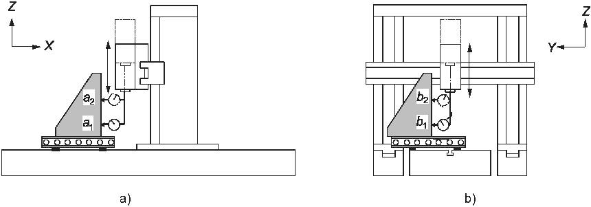Замечания и ссылки на ИСО 230-1:2012, 10.3.2.2 Следует поместить портал, подвижную перекладину и шпиндельную головку в среднее положение. Для a) необходимо установить поверочную линейку параллельно движению оси X с помощью регулируемых блоков, иначе при измерении необходимо учитывать отсутствие параллельности, а затем поместить на нее угольник. Следует закрепить индикатор часового типа на шпиндельной головке. Необходимо зафиксировать подвижную перекладину на колоннах, где это возможно. Следует приложить щуп индикатора часового типа к угольнику в положении a1, измерив в направлении X, и обнулить индикатор часового типа. Переместить ось Z в положение a2 и записать показания индикатора часового типа. Ошибка перпендикулярности, EB(0X)Z, которая должна быть сообщена, представляет собой отношение между показанием в a2 и пройденным расстоянием по оси Z. Для b) необходимо установить линейку параллельно движению оси Y с помощью регулируемых блоков, иначе при измерении следует учитывать отсутствие параллельности, а затем поместить на нее угольник. Следует приложить щуп индикатора часового типа к угольнику в положении b1, измерив в направлении Y, и обнулить индикатор часового типа. Переместить ось Z в положение b2 и записать показания индикатора часового типа. Ошибка перпендикулярности, EA(0Y)Z, которая должна быть сообщена, представляет собой отношение между показанием в b2 и пройденным расстоянием по оси Z. Для больших станков проверка ошибки перпендикулярности оси ZX, EB(0X)Z, должна быть повторена в двух крайних положениях портала. Примечание - Эта испытательная настройка также применима к испытаниям G5, G10 и G13. Использование линейки необязательно. | ||