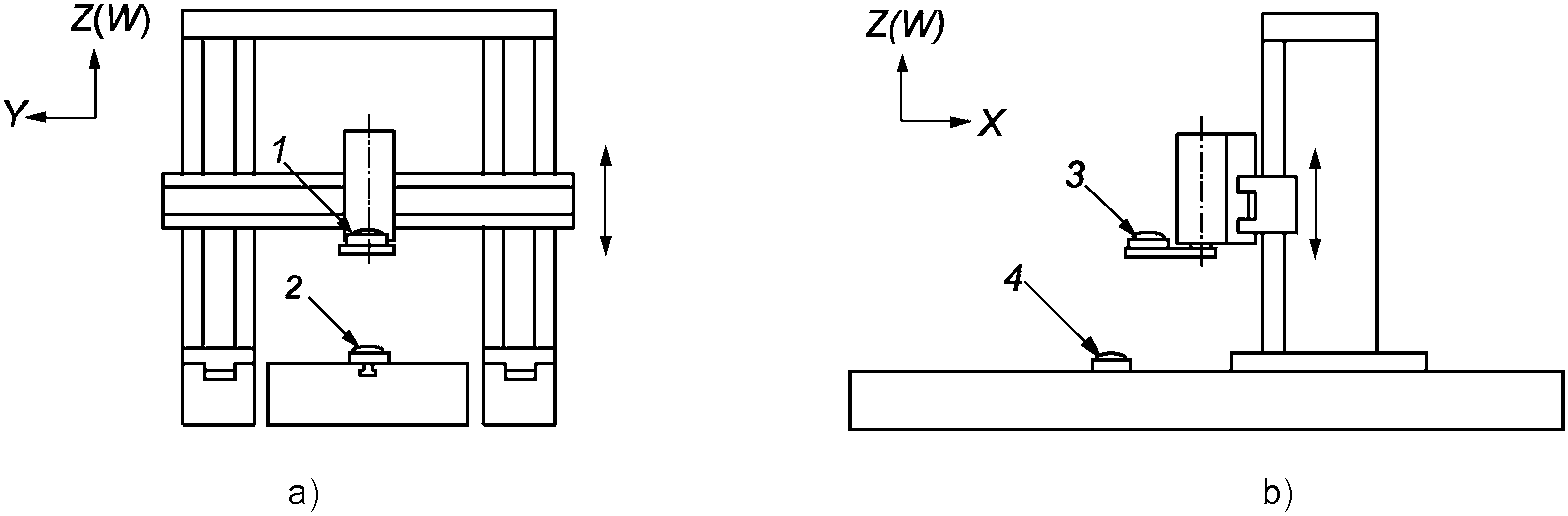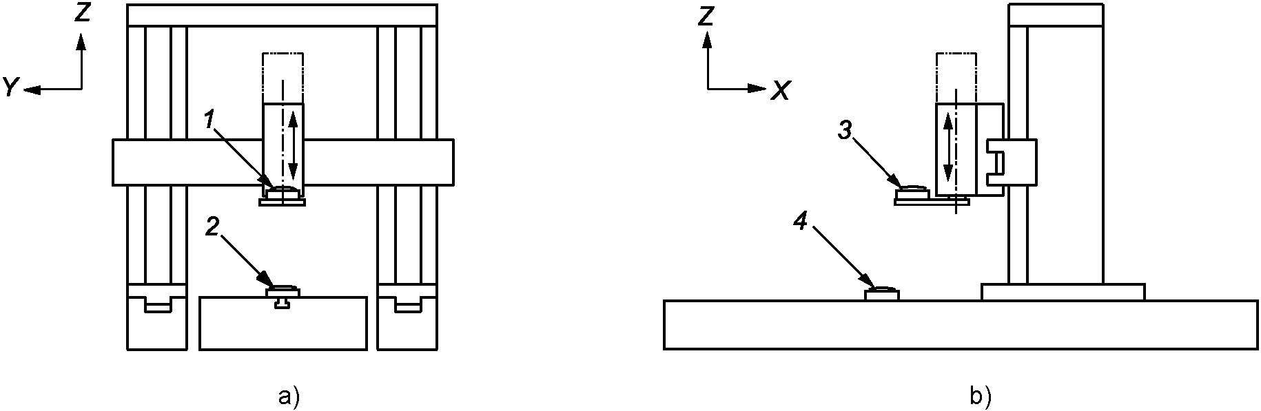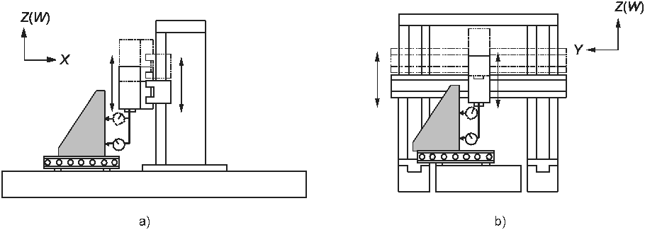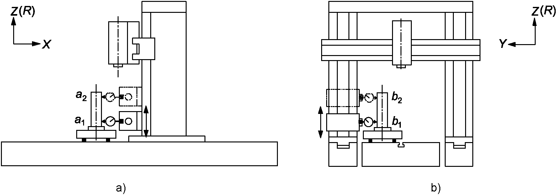 Замечания и ссылки на ИСО 230-1:2012 Уровень или отражатель или световозвращатель следует размещать на подвижном элементе: - для a), (EAZ): уровень необходимо размещать в направлении оси Y; - для b), (EBZ): уровень необходимо размещать в направлении оси X. Измерения следует проводить не менее чем в шести положениях вдоль хода с равноотстоящими шагами, не превышающими 300. | ||||||