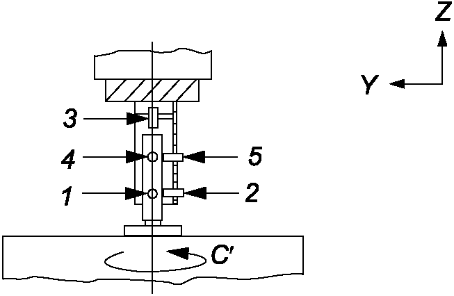 Замечания и ссылки на ИСО 230-7 Данное испытание представляет собой испытание шпинделя с чувствительным направлением вращения (см. ИСО 230-7:2015, 5.3). Ошибочные смещения шпинделя могут быть разными в разных положениях поперечной направляющей или ползуна из-за возможного влияния структурной динамики станка. Местоположение измерительной установки (положения X, Y, Z и W) должно быть согласовано между изготовителем/поставщиком и пользователем. После настройки измерительного прибора шпиндель должен быть прогрет до 50% от максимальной скорости шпинделя в течение 10 мин, если иное не согласовано между изготовителем/поставщиком и пользователем. Измерения следует проводить следующим образом. a) Значение полной радиальной погрешности перемещения, EXY(C) (с использованием датчиков 1 и 2): измерение радиальной погрешности перемещения описано в ИСО 230-7:2015, 5.3.2. Ее следует измерять как можно ближе к носовой части шпинделя. Должен быть предоставлен полярный график полной погрешности перемещения с центром LSC. b) Значение полной осевой погрешности перемещения, EZ(C) (с использованием датчика 3): Измерение осевой погрешности перемещения описано в ИСО 230-7:2015, 5.3.4. Для осевой погрешности перемещения, EZ(C), следует предоставить полярный график полной погрешности перемещения с центром полярной диаграммы (PC). c) Значения полной погрешности перемещения при наклоне, EAB(C) (с использованием датчиков 1, 2, 4 и 5): измерение погрешности перемещения при наклоне описано в ИСО 230-7:2015, 5.3.3. Погрешность перемещения при наклоне также можно проверить с помощью всего двух бесконтактных датчиков (см. ИСО 230-7:2015, 5.3.3.2). Для погрешности перемещения, EAB(C), следует предоставить полярный график полной погрешности перемещения с центром PC. | |||||