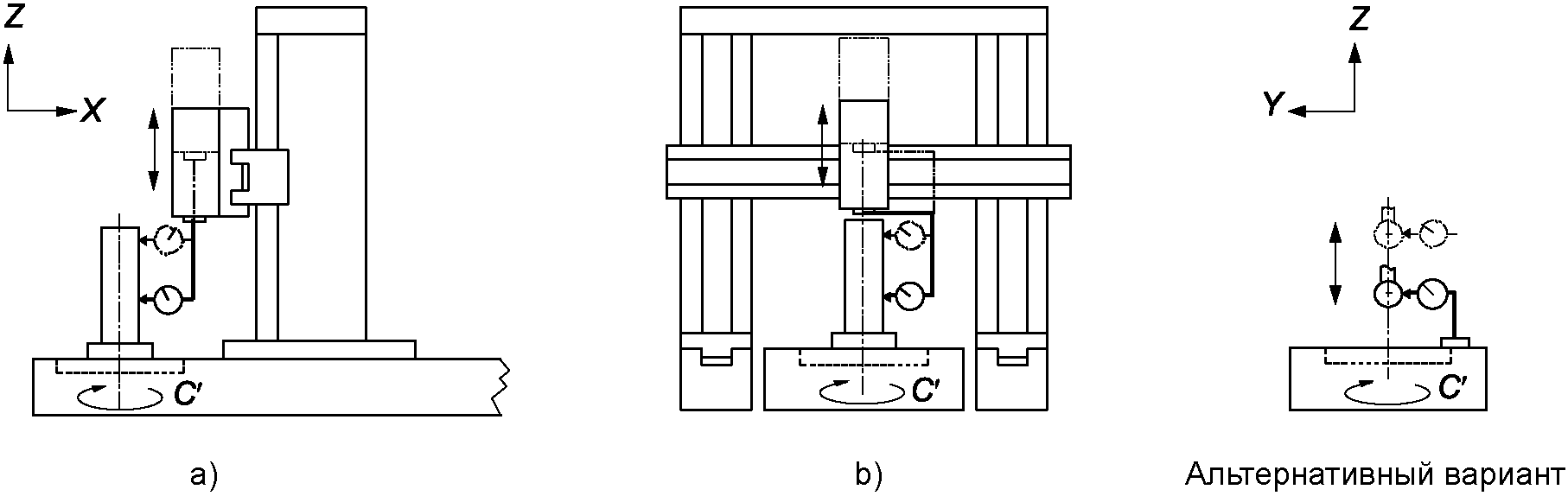 Замечания и ссылки на ИСО 230-1:2012, 3.4.3; ИСО 230-2:2014, раздел 3, 5.3.4 и 5.3.5 Необходимо закрепить автоколлиматор на стороне шпинделя станка и закрепить многоугольное зеркало около центра стола, выровняв его с автоколлиматором в первой измерительной поворотной позиции. Если движение поворотного стола не вызывает никакого движения между плунжером и неподвижной частью станка, автоколлиматор допускается закрепить на неподвижной части станка. Положения мишени должны быть выбраны в соответствии с ИСО 230-2:2014, таблица 1. Скорость подачи углового позиционирования должна быть согласована между изготовителем/поставщиком и пользователем. Что касается условий испытаний, программы испытаний и представления результатов, следует ссылаться на ИСО 230-2:2014, разделы 3, 4 и 7, и 8.2.4. | ||||