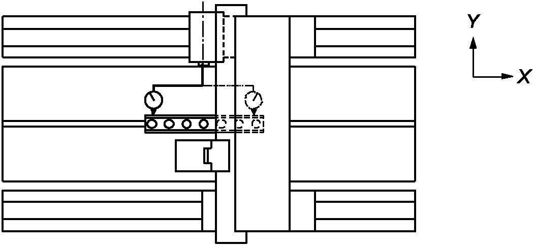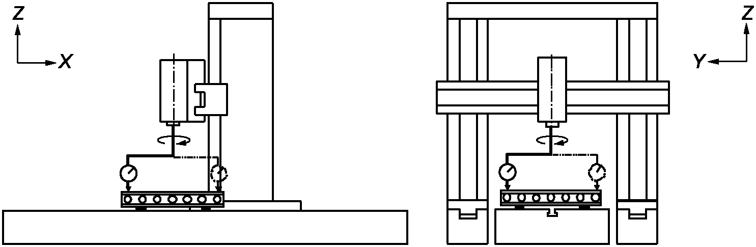 Замечания и ссылки на ИСО 230-1:2012, 12.3.2.5.2 Следует прикрепить индикатор часового типа к шпинделю держателя инструмента или к головке около шпинделя. Щуп индикатора часового типа должен касаться поверхности стола напрямую или касаться плоскопараллельной концевой меры длины, расположенной на поверхности стола. Шпиндельная головка находится в середине хода. Необходимо переместить портал в направлении X и записать показания индикатора часового типа. Измерения следует проводить в ряде положений, равномерно распределенных с шагом, не превышающим 1/10 самой длинной стороны стола [см. схему a)]. Следует повторить испытание в двух других положениях оси Y шпиндельной головки, симметричных предыдущему положению, и записать максимальную разницу показаний таким же образом [см. схему b)]. Ошибка параллельности, которая должна быть зарегистрирована, является наибольшей из максимальных разниц, зарегистрированных в каждом положении оси Y. | |||||