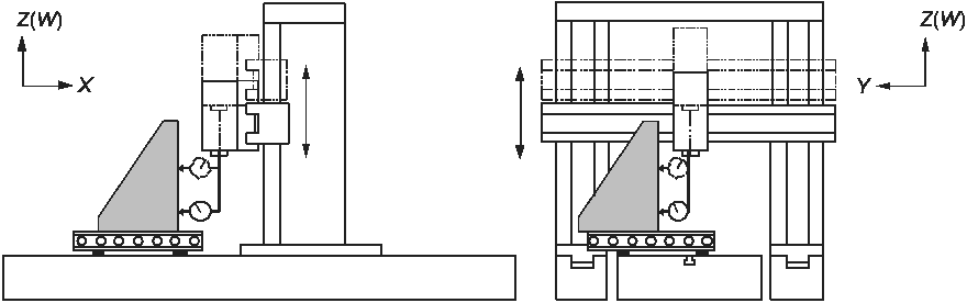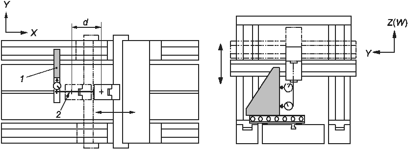 Замечания и ссылки на ИСО 230-1:2012, 8.4.2.4 Следует установить угольник, ориентированный для измерения в направлении Y. Необходимо установить индикатор часового типа на специальное коромысло с большой длиной; снять показания в разных положениях оси W и записать их. Измерения следует проводить как минимум в шести положениях вдоль хода оси W с равноотстоящими шагами, не превышающими 500. Если перекладина может перемещаться только при позиционировании с фиксированными шагами, положения измерений должны быть выбраны соответствующим образом. Следует установить индикатор часового типа на специальное коромысло с малой длиной. Необходимо переместить портал так, чтобы индикатор часового типа коснулся угольника в той же точке(ах), где были сняты предыдущие показания, и повторить измерения в тех же положениях оси W. Крен оси W, ECW, который должен быть указан, представляет собой максимальную разницу показаний индикатора часового типа в двух разных положениях оси X. в каждом измеренном положении оси W, деленную на расстояние d, пройденное вдоль оси X. Крен оси X, EAX, должен быть измерен и учтен. | |||||