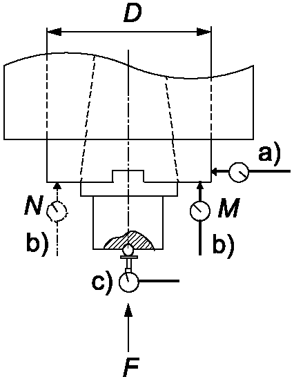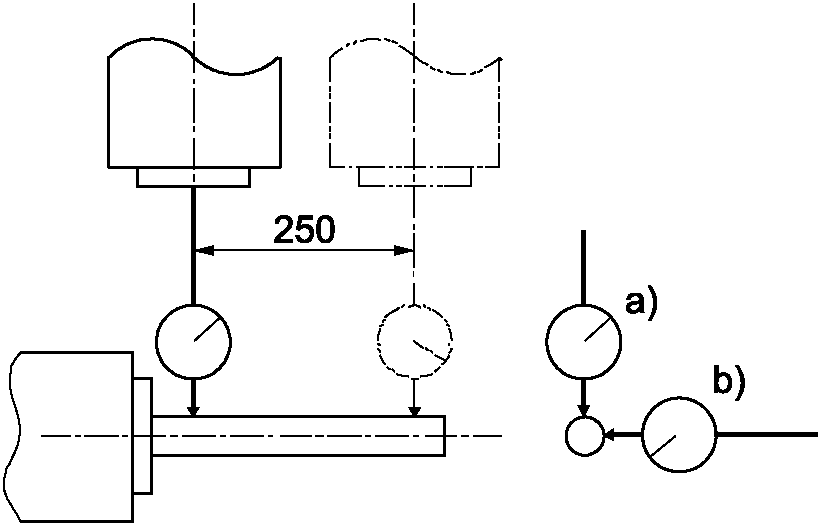 Средства измерений Испытательная оправка, бесконтактные датчики и угловое измерительное устройство или две прецизионные сферы, расположенные слегка эксцентрично к средней линии шпинделя и бесконтактным датчикам. Необходимо учитывать максимальную безопасную скорость вращения испытательной оправки. | |||||