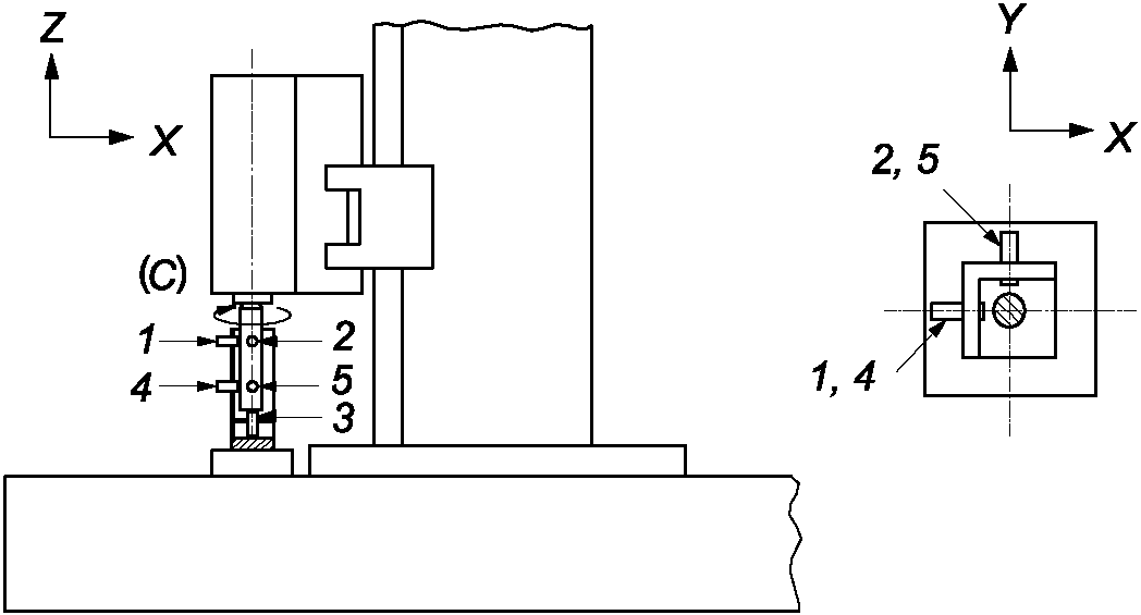 Замечания и ссылки на ИСО 230-7: Данное испытание представляет собой испытание поворотного стола с фиксированным чувствительным направлением (см. ИСО 230-7:2015, 5.4). После настройки измерительного прибора поворотный стол должен быть прогрет на 50% от максимальной скорости поворотного стола в течение 10 мин, если иное не согласовано между изготовителем/поставщиком и пользователем. Измерения следует проводить следующим образом: Для a) и b) общие значения радиальной погрешности перемещения EXC' и EYC' (с использованием датчиков 1 и 2): измерение радиальной погрешности перемещения описано в ИСО 230-7:2015, 5.4.3. Ее следует измерять как можно ближе к носу шпинделя. Для каждой радиальной погрешности перемещения EXC' и EYC' должен быть предоставлен полярный график общей погрешности перемещения с центром в виде окружности наименьших квадратов (LSC). Для c) значение общей осевой погрешности перемещения EZC' (с использованием датчика 3): измерение осевой погрешности перемещения описано в ИСО 230-7:2015, 5.4.4. Для осевой погрешности перемещения EZC' следует предоставить полярный график общей погрешности перемещения с центром PC. Для d) и e) значения общей погрешности перемещения наклона EAC' и EBC' (с использованием датчиков 2 и 5, 1 и 4): измерение погрешности перемещения наклона описано в ИСО 230-7:2015, 5.4.5. Любую погрешность перемещения наклона также можно проверить с помощью всего одного бесконтактного датчика (см. ИСО 230-7:2015, 5.4.5.3). Для каждого ошибочного смещения наклона EAC' и EBC' следует предоставить полярный график общего ошибочного смещения с центром PC. | |||||