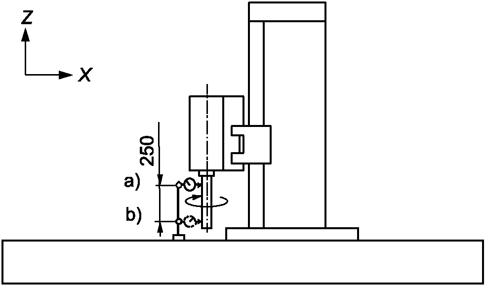 Замечания и ссылки на ИСО 230-1:2012, 8.4.2.1, 8.4.2.2 и 8.4.2.3 Для a) и b) следует поместить уровень в середине хода перекладины или, в случае станков только с одной вертикальной шпиндельной головкой, поместить уровень на шпиндельную головку. Необходимо разместить вертикальные шпиндельные головки симметрично относительно стола. Для станков только с одной вертикальной шпиндельной головкой она должна быть размещена в центральном положении. Следует зафиксировать перекладину в каждом положении, где это возможно. Измерения следует проводить как минимум в шести положениях вдоль хода с равноотстоящими шагами, не превышающими 500. Если перекладина подвижна только при позиционировании в фиксированных шагах, положения измерений должны быть выбраны соответствующим образом. | ||||||
