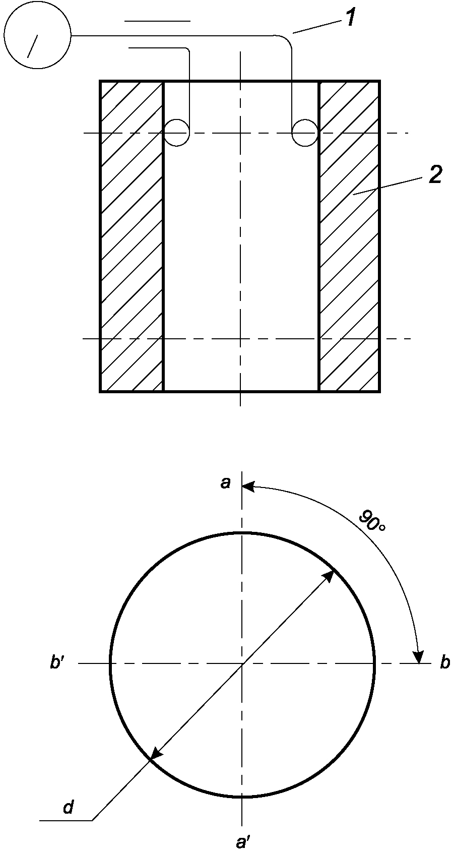 1 - нутромер; 2 - цилиндрическая поверхность образца