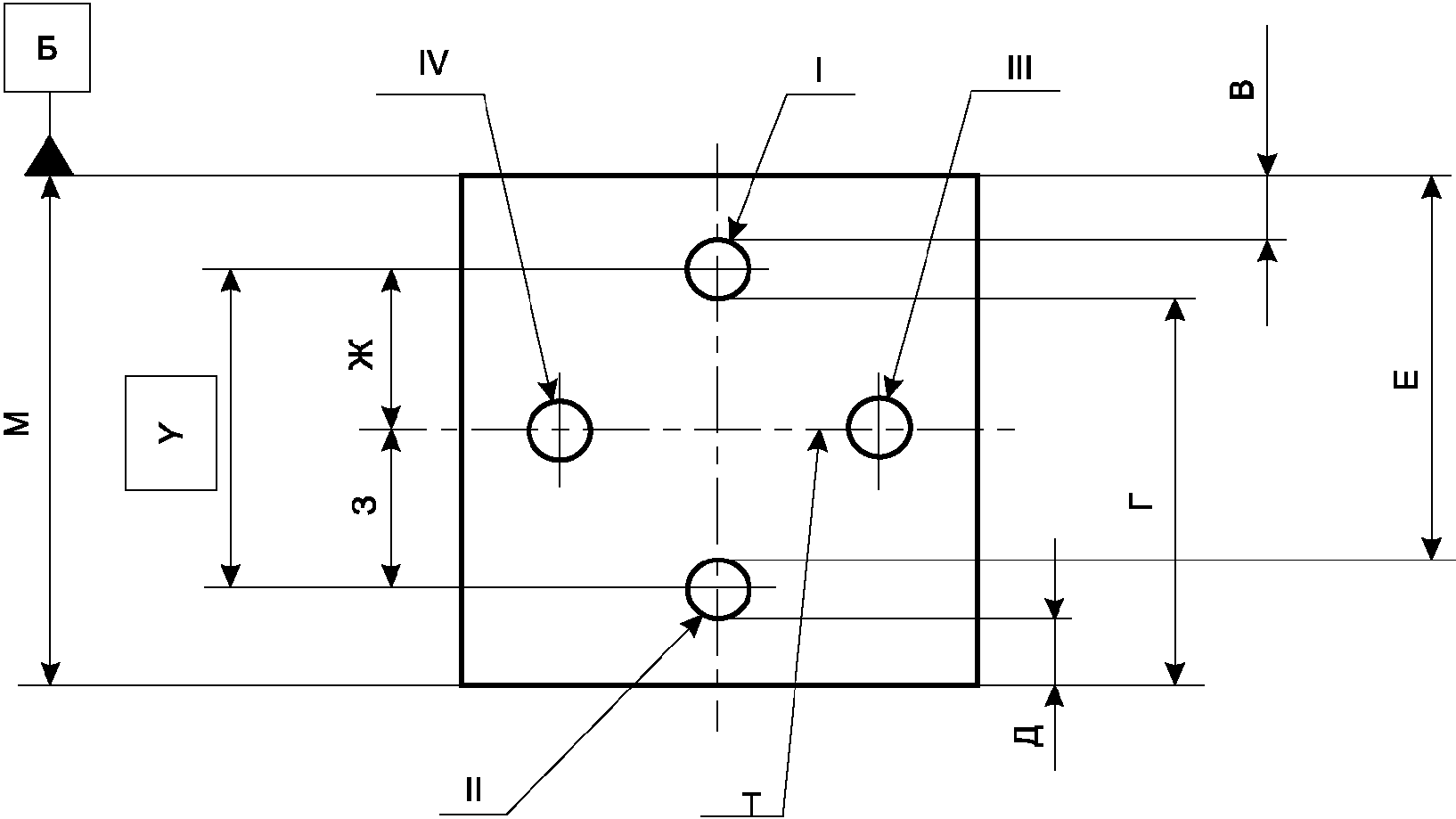 Г.2 Измеряя фактические расстояния В, Г, Д, Е, находят размеры Ж и З, по которым определяют фактическое положение осей отверстий I, II от средней линии Т прямоугольника со стороной М. Размеры Ж и З вычисляют по формулам: