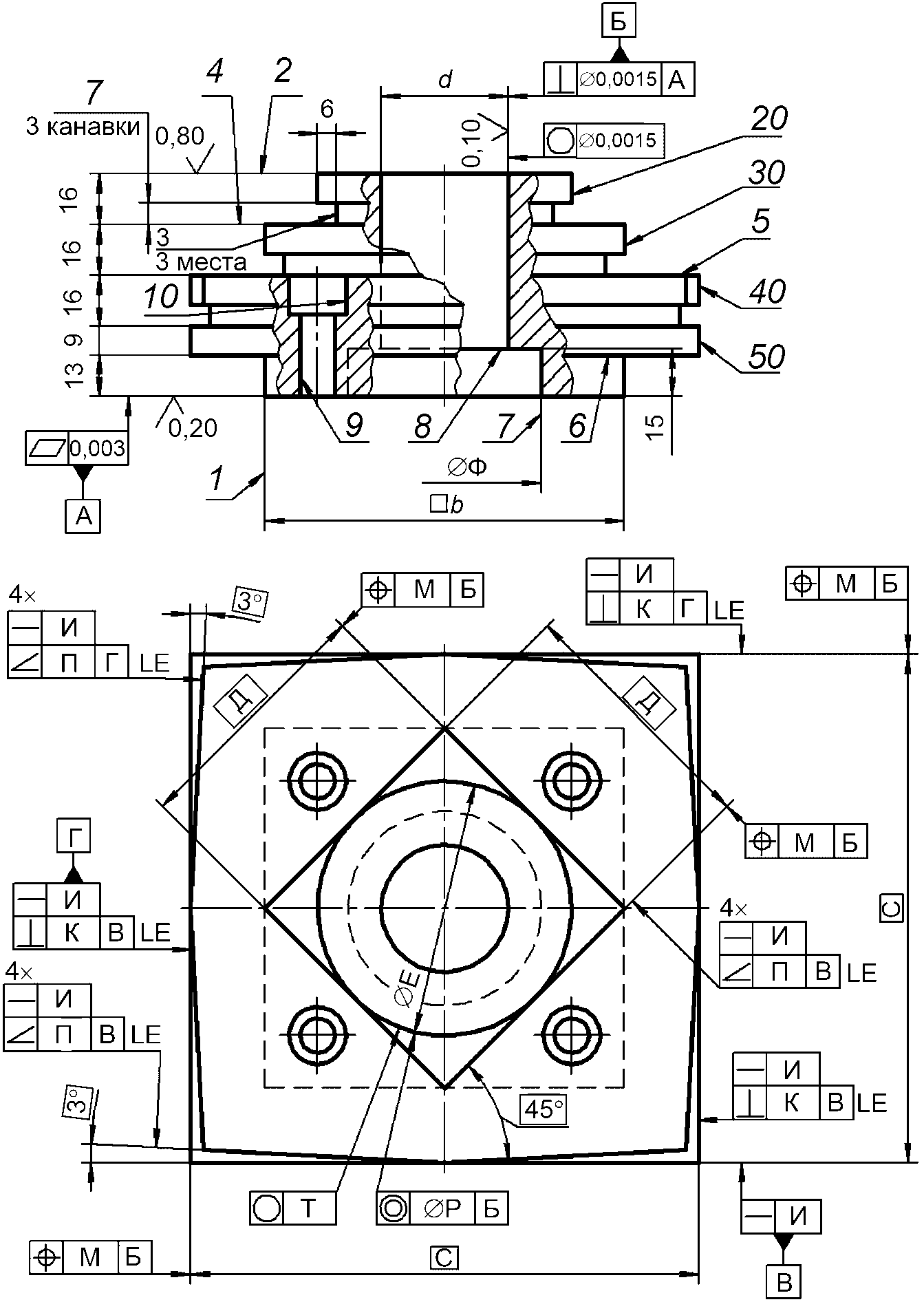 Г.4 Смещение осей отверстий III, IV от теоретически точных размеров относительно базы Б, друг друга и относительно базы А осуществляется аналогично как и для отверстий I, II.
