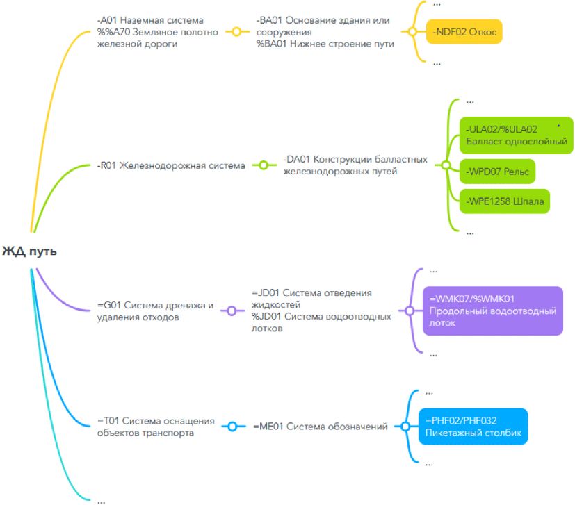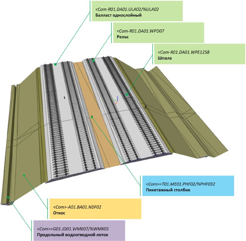 Системная декомпозиция для фрагмента ЖД пути с закодированными компонентами, приведена на