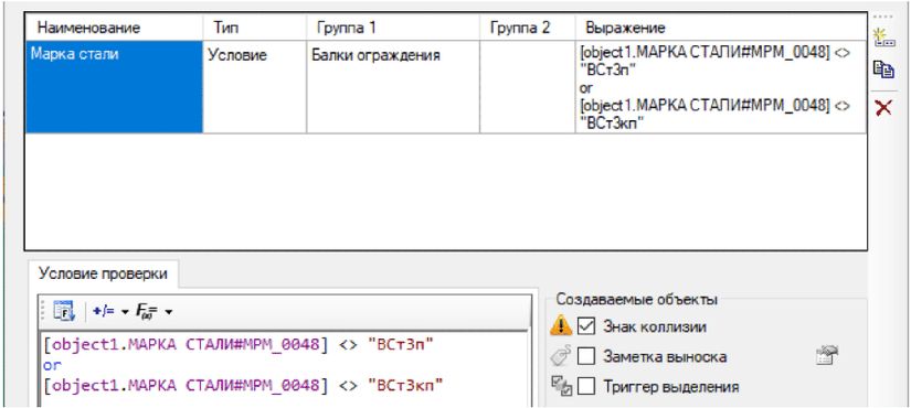 Настройки для проверки ЦИМ на нормируемые значения марок стали для балок барьерного ограждения в "