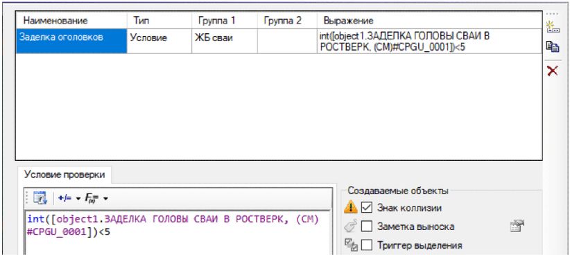 CADLib Модель и Архив" применяется соответствующий инструмент "Проверка коллизий". Настройки для профиля проверки на величину заделки головы сваи в тело ростверка приведены на