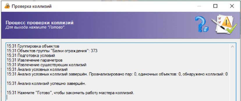Согласно протоколу проверки, в анализе участвовало 4 объекта (найденных по коду типа класса '%ULK01'). По итогам анализа коллизий не выявлено.