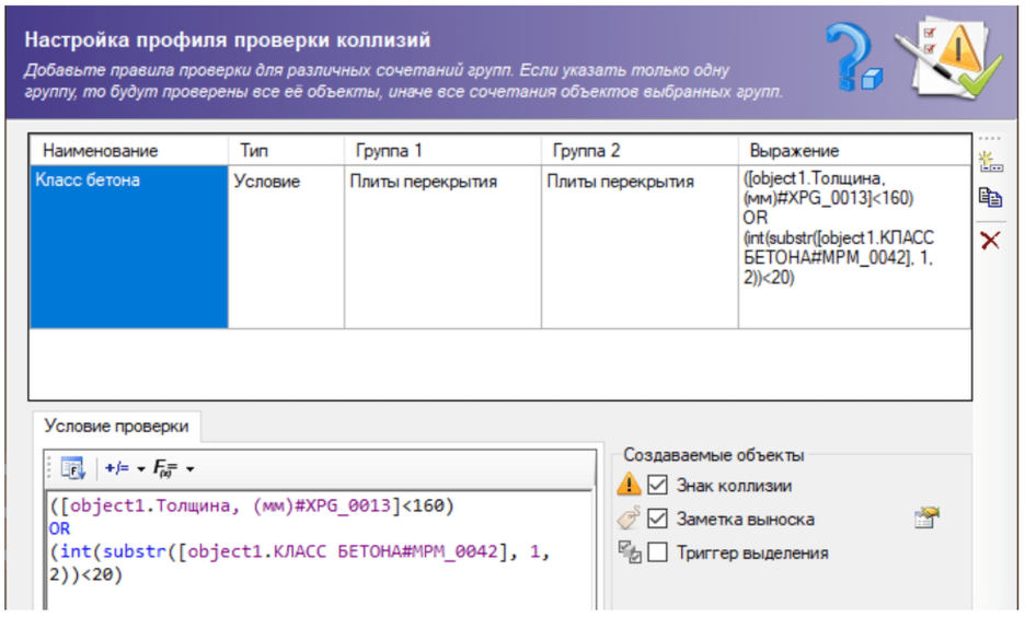 Реализация проверки плит перекрытий аналогична ранее приведенным примерам проверок, отличие заключается в необходимости проверки значений сразу для двух атрибутов (класса бетона и толщина плиты).