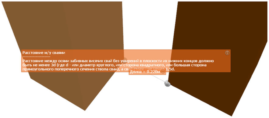 1 | Расстояние между осями забивных висячих свай без уширений в плоскости их нижних концов должно быть не менее 3d (где d - или диаметр круглого, или сторона квадратного, или большая сторона прямоугольного поперечного сечения ствола сваи), а свай-стоек - не менее 1,5d. | Получить выборку свай, расстояния между поверхностями которых (гранями) менее (3d-x), где x - значение атрибута "Ширина сечения сваи, (мм)#XPGU_0002" |