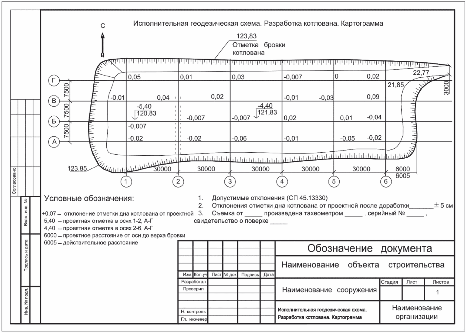 Для исключения разногласий в процессе приемки выполненных работ на исполнительных геодезических схемах (чертежах) указывают без дублирования действительной информации на разрезах и на плане: