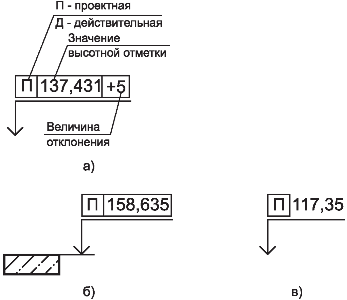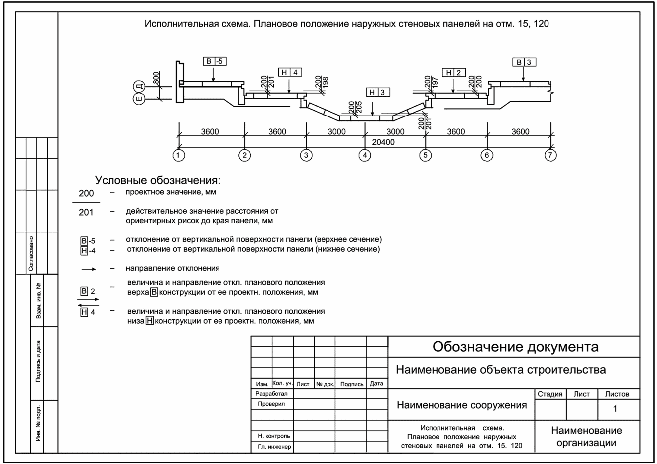 - условные знаки или контуры (планы, профили, разрезы, сечения) строительных конструкций, сетей инженерно-технического обеспечения с указанием их назначений, проектных и действительных размеров и значений отклонений от проектных параметров;