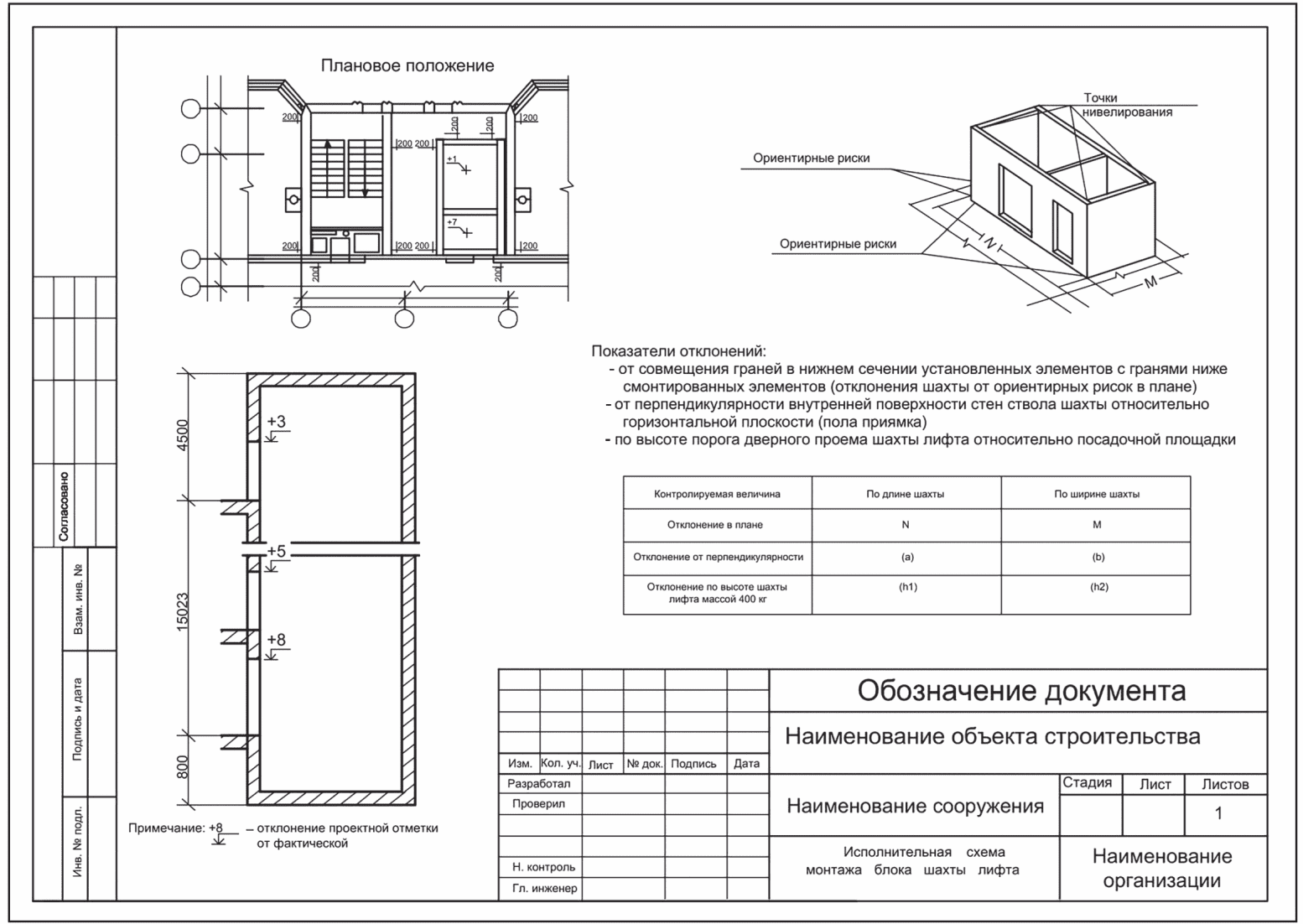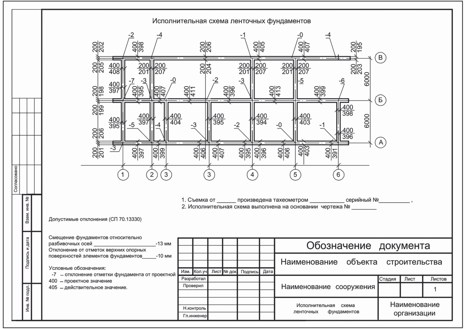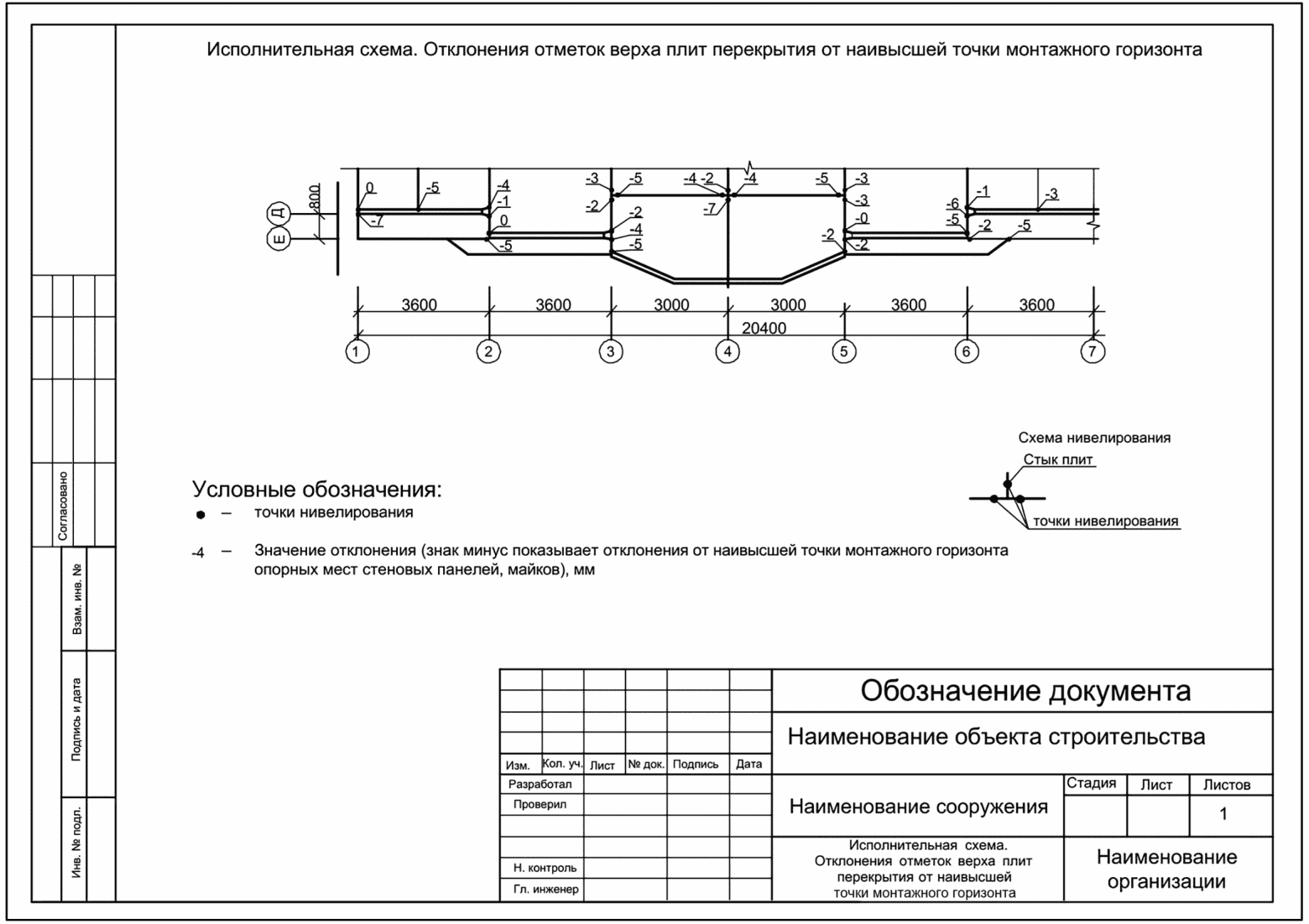 - проектные и действительные отметки контролируемых параметров конструкций аналогично способу, используемому в проектной документации;