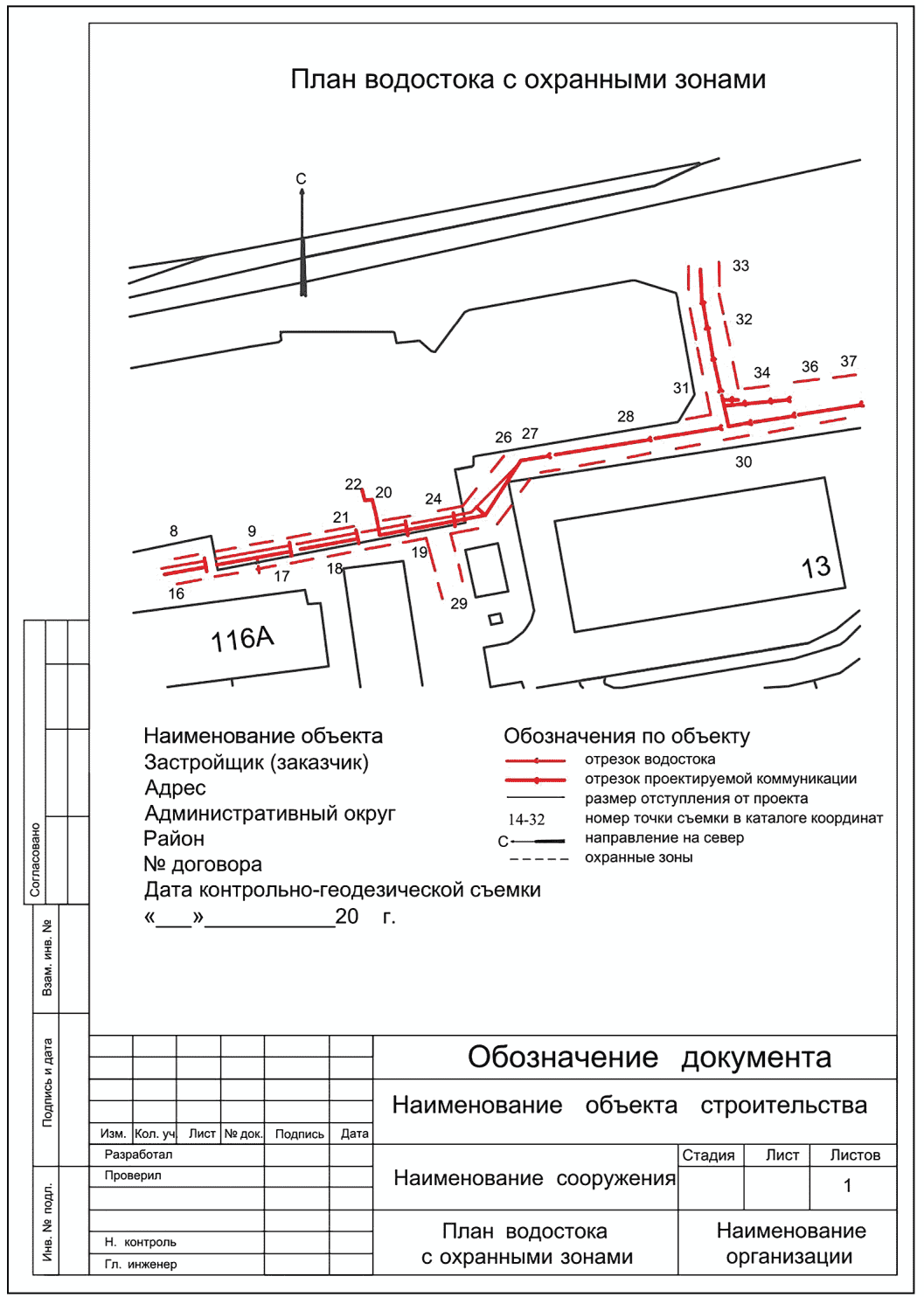 Д.3 представлены примеры оформления геодезической исполнительной документации планов с охранными зонами и профилей.