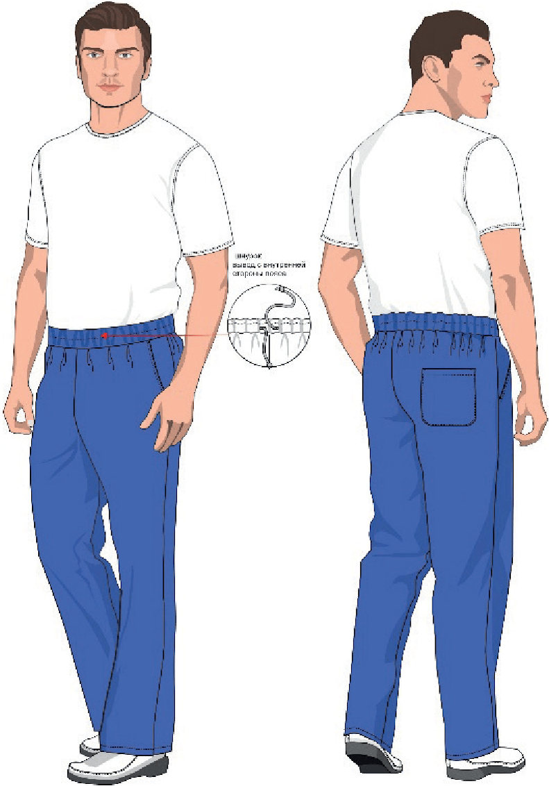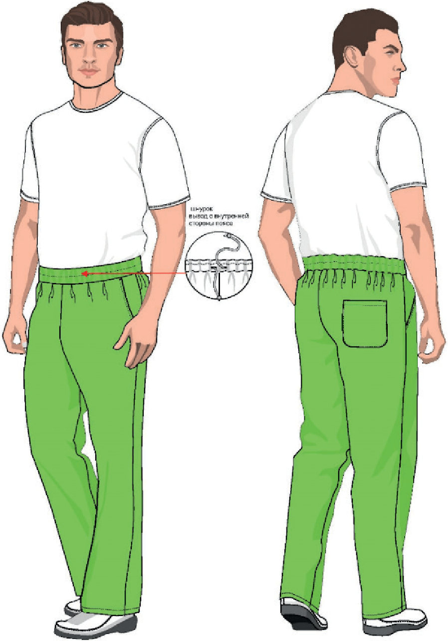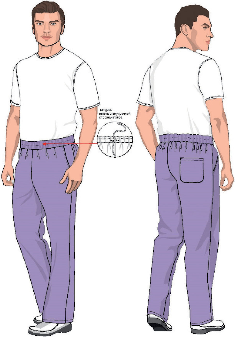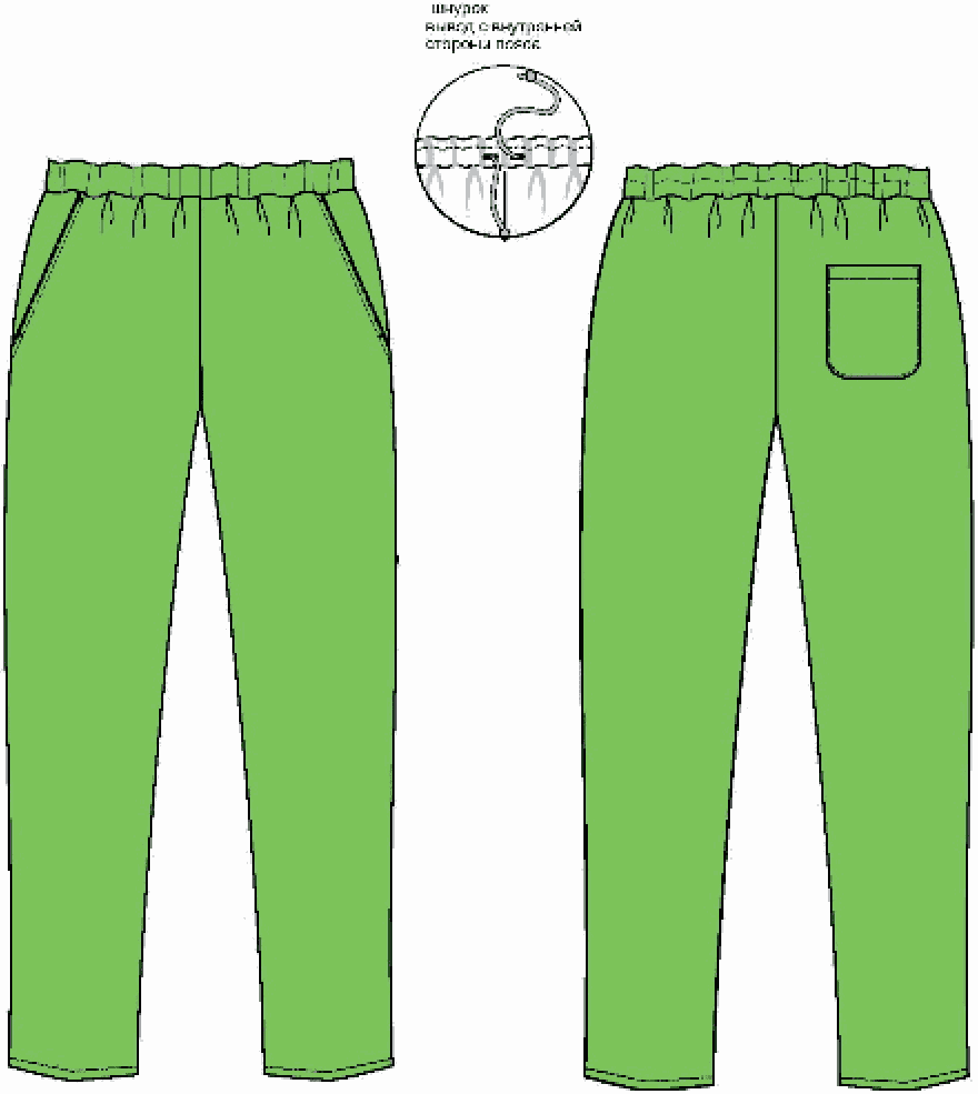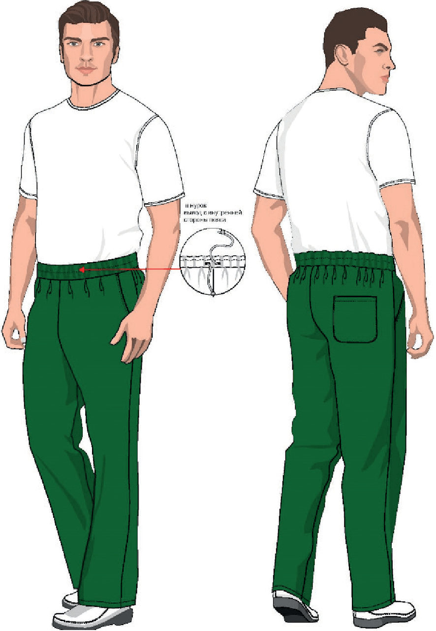 7 | Навесная маркировка: навесной товарный ярлык (из белого картона) рекомендации по эксплуатации (бумажный лист формата A5) | | Навешиваются с помощью этикеткодержателя на припуск шва притачивания пояса у среднего шва задних половинок брюк |