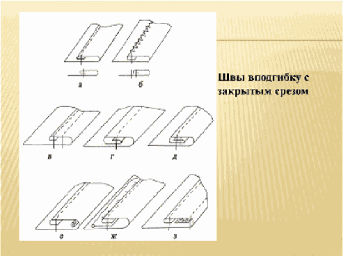 Шов вподгибку | | | Краевой шов, применяющийся для обработки нижних частей деталей изделий (рукава, низ изделий и т.д.). |