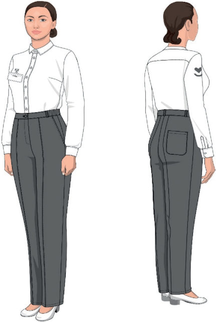 7 | Вшивная маркировка: ярлык с указанием размера/роста; ярлык с указанием символов по уходу и состава | НТД производителя | В блузах - втачивается под нижний край настрачивания обтачки по центру горловины спинки. В брюках - втачивается в средний шов задних половинок на расстоянии 5,0 - 10,0 см от шва притачивания пояса. |