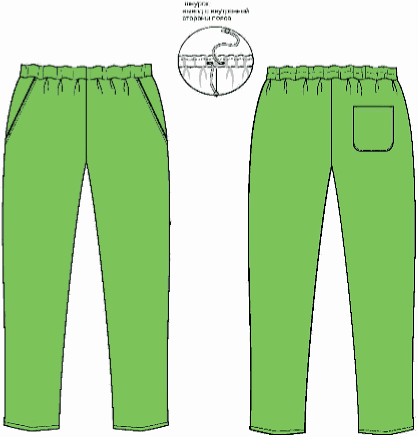 1 | Ткань из натуральных (хлопок) или искусственных (вискозы) волокон не менее 35%, (при наличии эластомерных нитей допустимо уменьшение содержания волокон на 3%); Отделка: антибактериальная; Вес: 200 - 240 г/м2 | НТД производителя | Для основных деталей изделия |