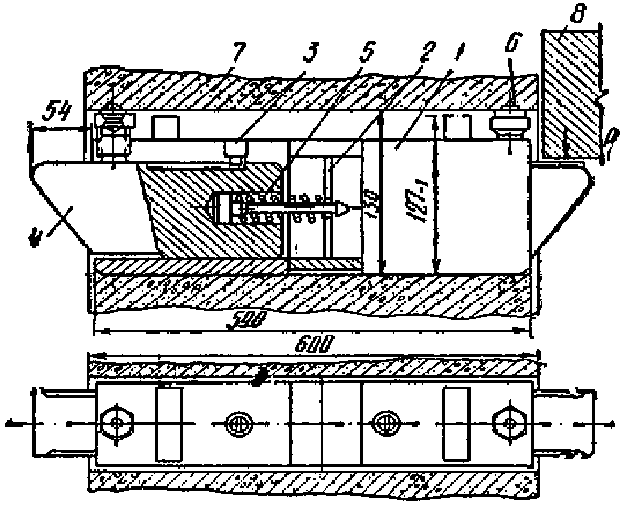 Затем, открывая золотник 6, масло подается в гидроцилиндры и плунжеры вместе с верхней траверсой поднимаются вверх. Шестерни также поднимаются вверх, захватывая по пути оставленные верхние следящие гайки, которые через резьбу приподнимают грузовые тяги, а вместе с ними и перекрытия только на разницу между ходом плунжеров и свободным ходом верхних следящих гаек.
