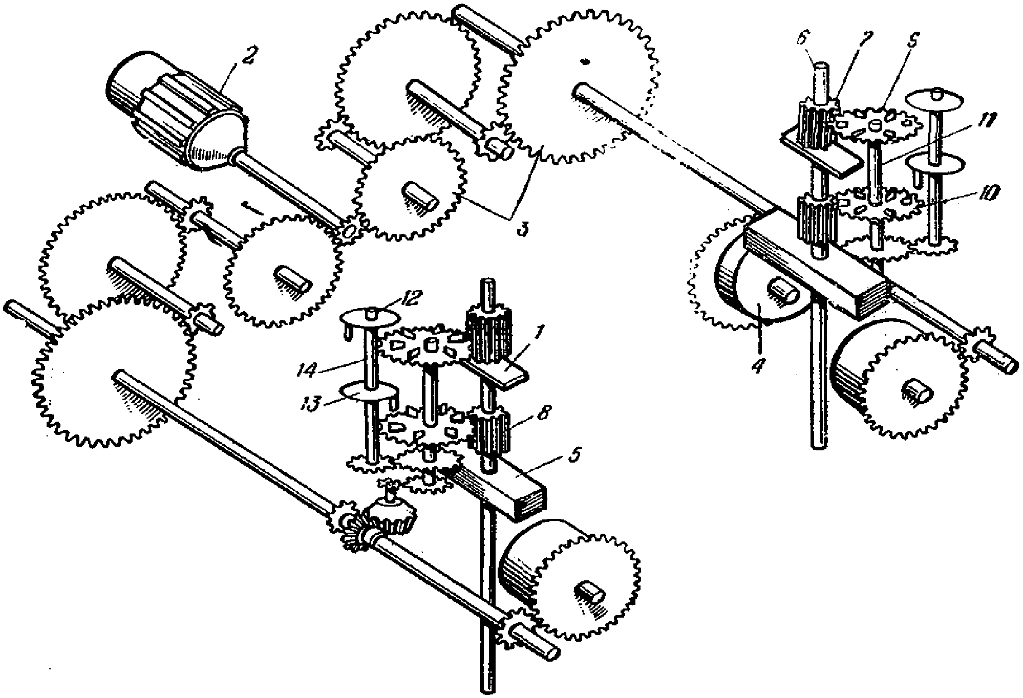 На рис. 15 изображена кинематическая схема подъемника. На неподвижной опоре 1 установлены: электродвигатель с редуктором 2, системы шестерен 3, эксцентрики 4, воздействующие на подвижные опоры 5, грузовые винты 6 с верхними 7 и нижними 8 гайками-шестернями, зубчатые колеса 9 и 10, снабженные тормозами (на рис. не показаны), свободно сидящие на валах 11 и вращающие гайки шестерни 7 и 8, а также водила 12 и 13, закрепленные на валах 14.