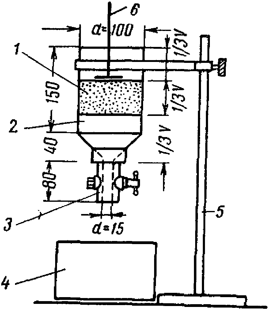 сек) погружения цилиндра (плунжера) в раствор, заполняющий вертикальную стеклянную трубу определенного диаметра и высоты. На рис. 4 показан прибор типа вискозиметра для определения условной вязкости инъекционного раствора. Истечение (отмеченного на рисунке) объема раствора через насадку диаметром 15
