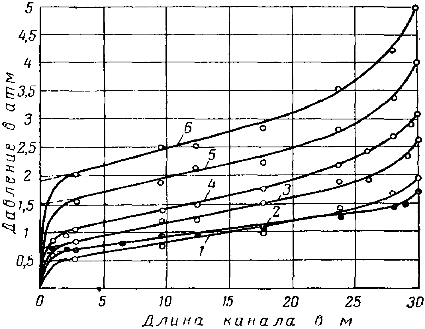 На рис. 18 приведены, по опытным данным, зависимости давлений на растворонасосе от вязкости раствора и длины канала, имеющего бетонные стенки и пучковую арматуру. Из графика видно, что с увеличением вязкости раствора и длины канала давление на растворонасосе возрастает по закону прямой. Искривление линий в начале и в конце обусловлено возрастанием сопротивления при входе и выходе раствора через малое отверстие в анкерной пробке и вследствие наклонных участков канала по концам.