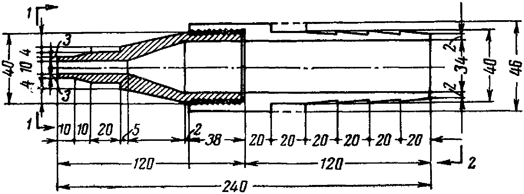 При применении пучковой арматуры с анкерами в виде стальных колодок и пробок подача раствора осуществляется через отверстие в анкерной пробке. В этом случае шланг, подающий раствор от насоса, снабжается стальным наконечником (рис. 17) с внутренним диаметром от 10 до 25 мм, входящим в отверстие пробки анкера. Зазоры между пробкой, проволоками и колодкой предварительно заделываются гипсовым тестом на воде или цементным тестом на жидком стекле (100 г жидкого стекла на 1 кг цемента). Раствор подается, таким образом, с одного конца канала до выхода его из отверстия в анкерной пробке на другом конце.