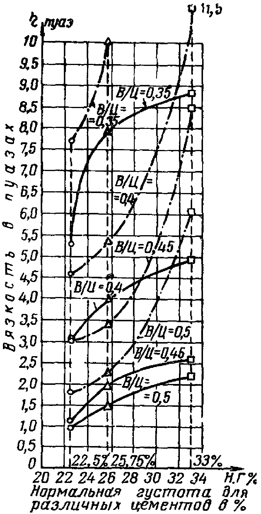 На рис. 1 приведены результаты опытов, характеризующие зависимость вязкости раствора от нормальной густоты цементного теста и В/Ц.