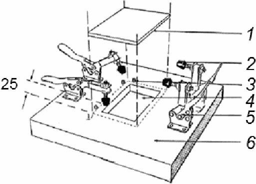 8.5 Образец помещают в зажимное приспособление по центру полости в приспособлении. Надежно закрепляют образец при помощи четырех зажимов. Зажимы должны быть удалены от торцов образца примерно на 25 мм.