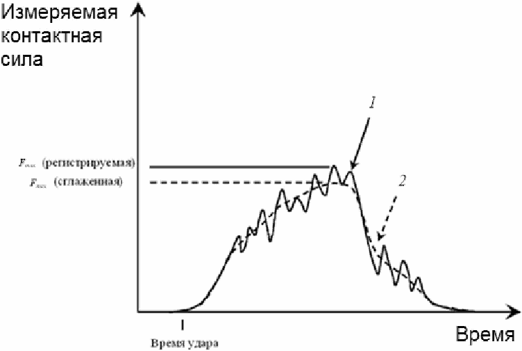 Начало контакта ударника с образцом фиксируют при отклонении значения контактной силы от нуля. Как только ударник касается поверхности образца, он изгибает образец и приводит к возникновению локальной вмятины, в результате контактная сила увеличивается. Резкие скачки контактной силы объясняются процессами разрушения, которые приводят к внезапной потере жесткости образца в зоне контакта.