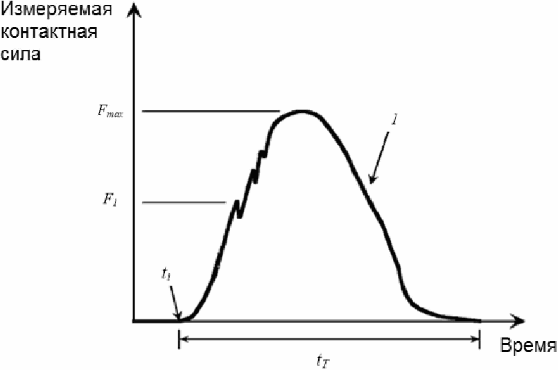 F1, Н - регистрируемая контактная сила в момент времени, когда кривая зависимости контактной силы от времени имеет спад по силе или наклон;