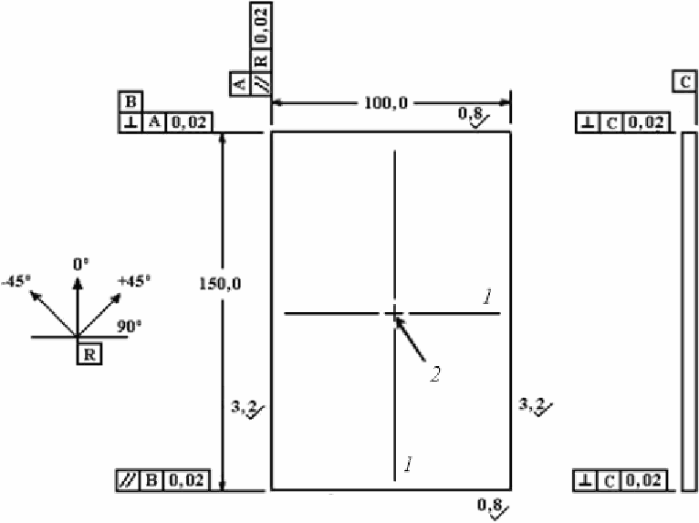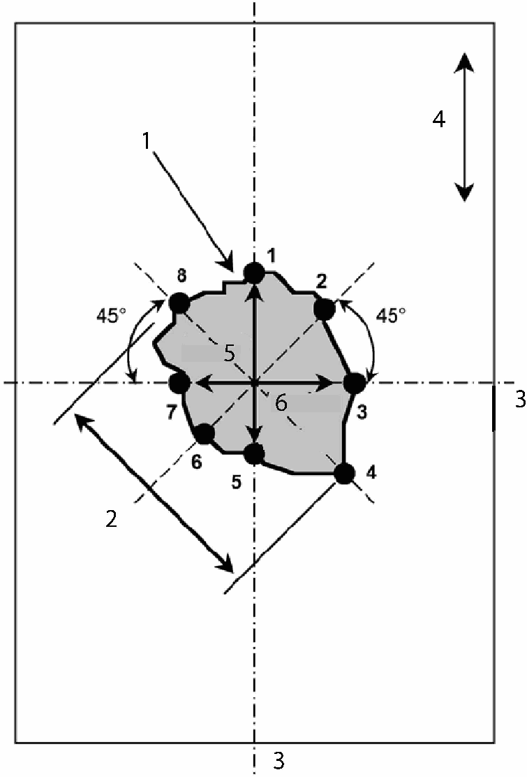 рисунком 8, отмечают местоположение восьми точек относительно центра образца. Определяют ширину