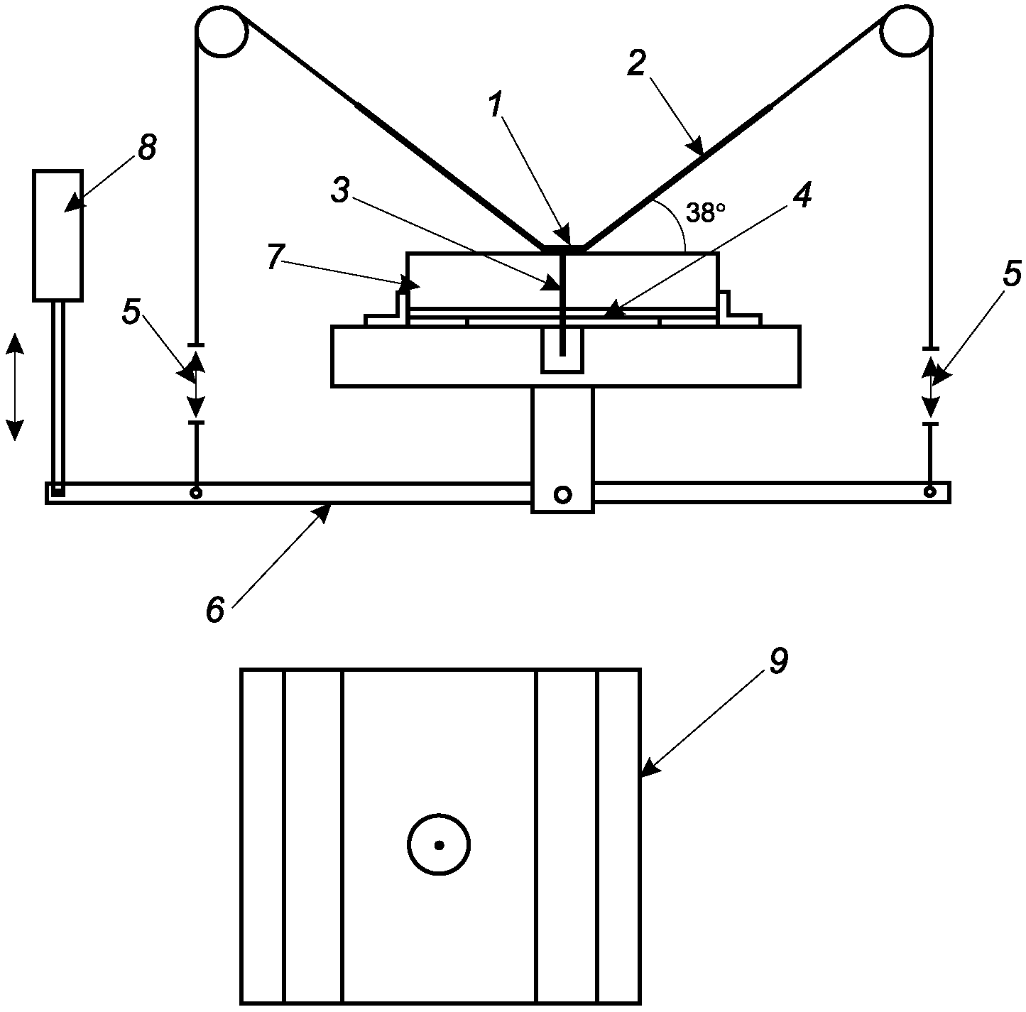 Передвижная рукоятка расположена горизонтально и длина кабелей отрегулирована так, чтобы нагрузка соответствовала усилию 0,1 кН.