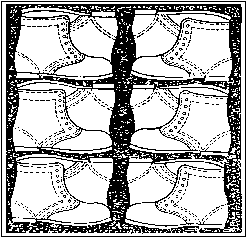 - из юфти и с голенищами из искусственных и синтетических материалов | - | Дощатые ящики из древесных листовых материалов, картонные ящики | Попарно связанные сапоги укладывают в ящик рядами без загиба голенищ таким образом, чтобы одна полупара была сдвинута по отношению к другой на высоту задника. Первый ряд укладывают по две пары вдоль длинной стороны ящика с расположением пяточной части сапог по углам ящика, пятую пару - посередине ящика носочной частью к стенкам ящика (см. рисунок Г.1). Второй ряд укладывают так же, как первый, за исключением пятой пары, которую укладывают носочной частью внутрь ящика носками друг к другу (см. рисунок Г.2). Каждый ряд обуви перекладывают оберточной бумагой |